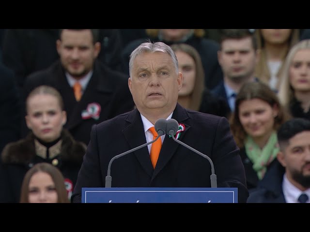 Magyarországnak a háborúból ki kell maradnia, egyetlen magyar sem kerülhet az "ukrán üllő és az orosz pöröly közé", ezért hazánk se katonát, se fegyvert nem fog küldeni a harcterekre, fogalmazott Orbán Viktor ünnepi beszédében a fővárosi Kossuth téren.
