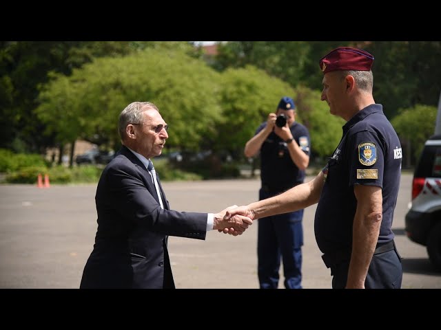 Dr. Pintér Sándor megtekintette a kiállított technikai eszközöket, a szolgálati járműveket, jelentéseket hallgatott meg a speciális tömegkezelési képességekről.