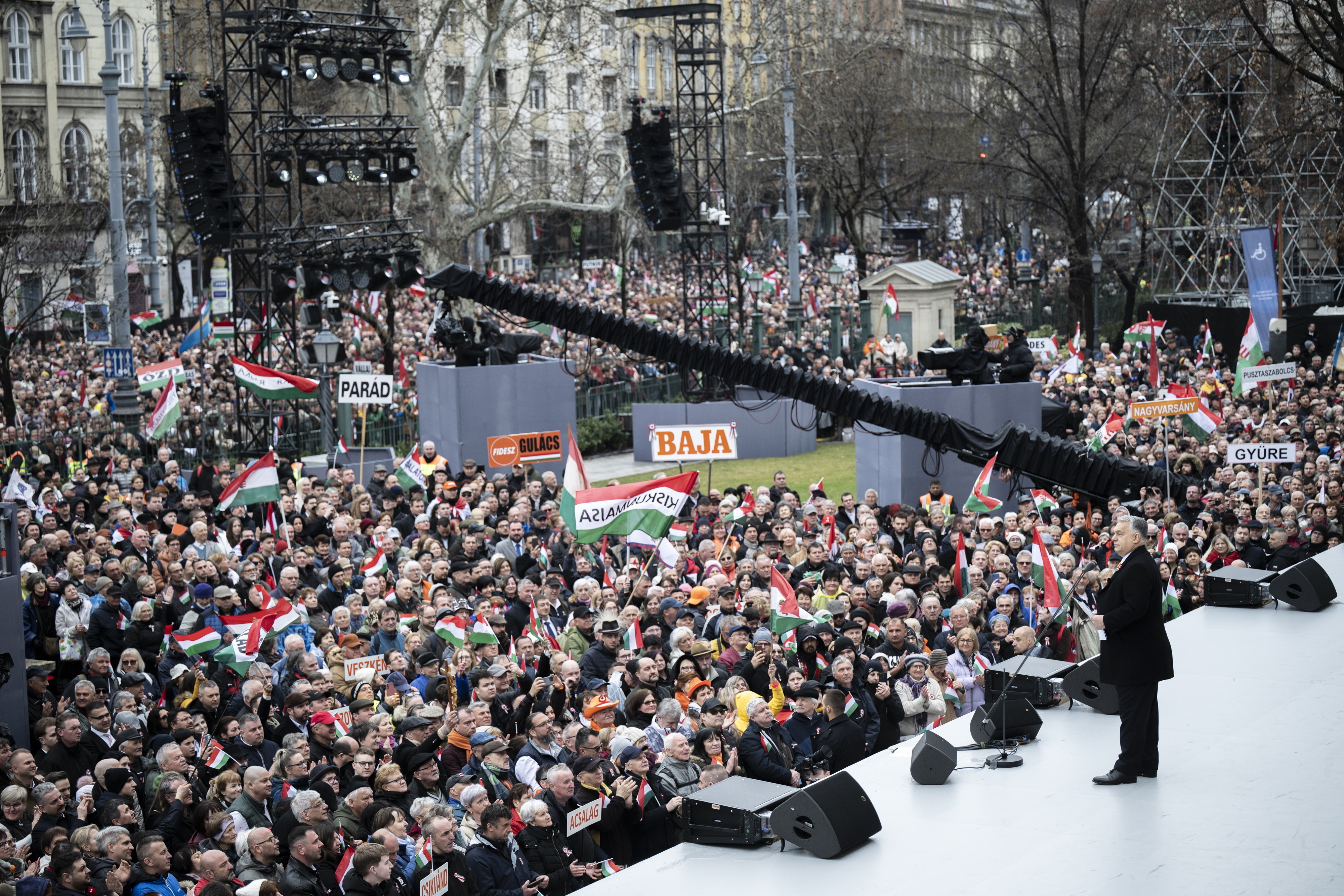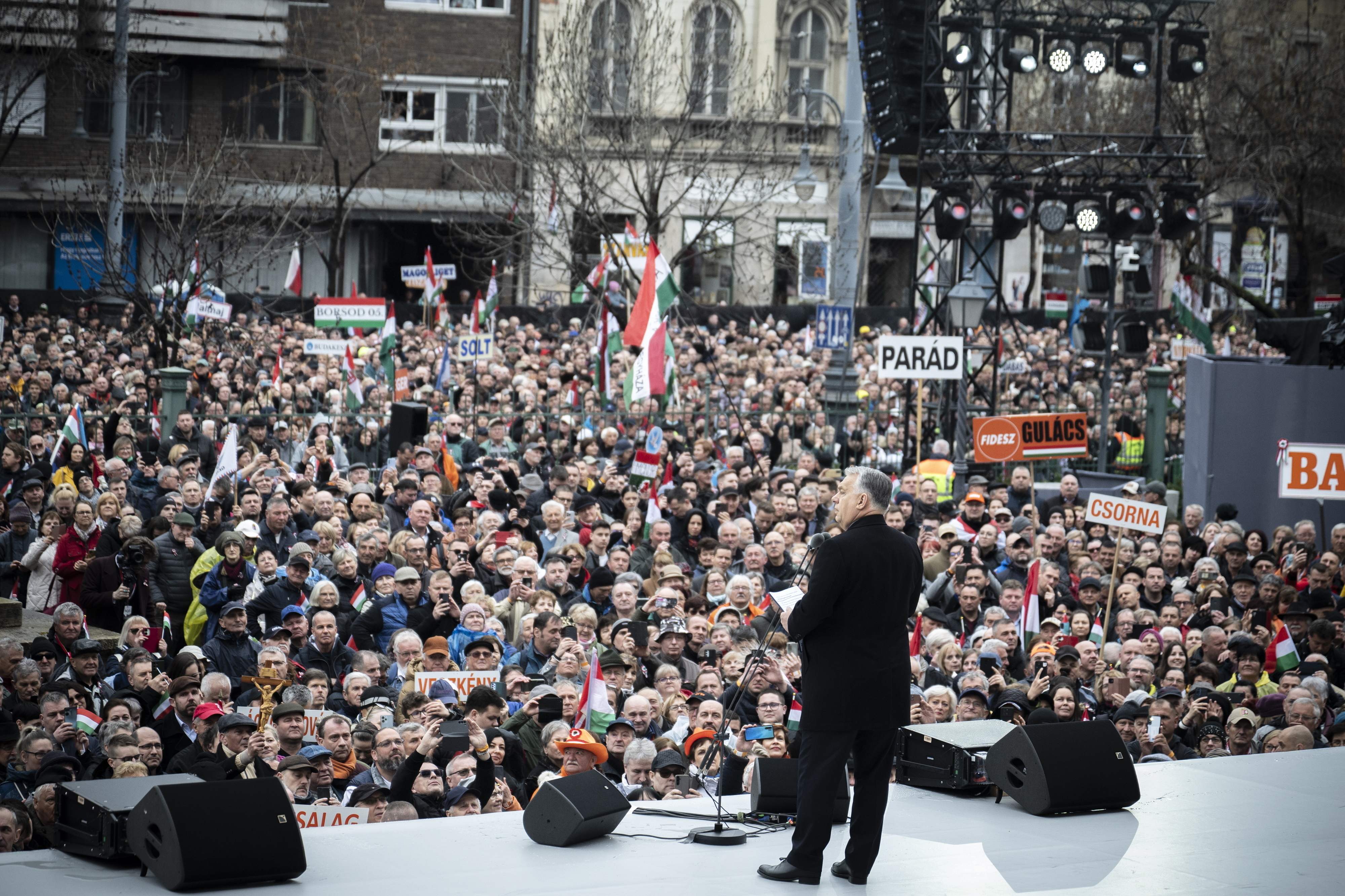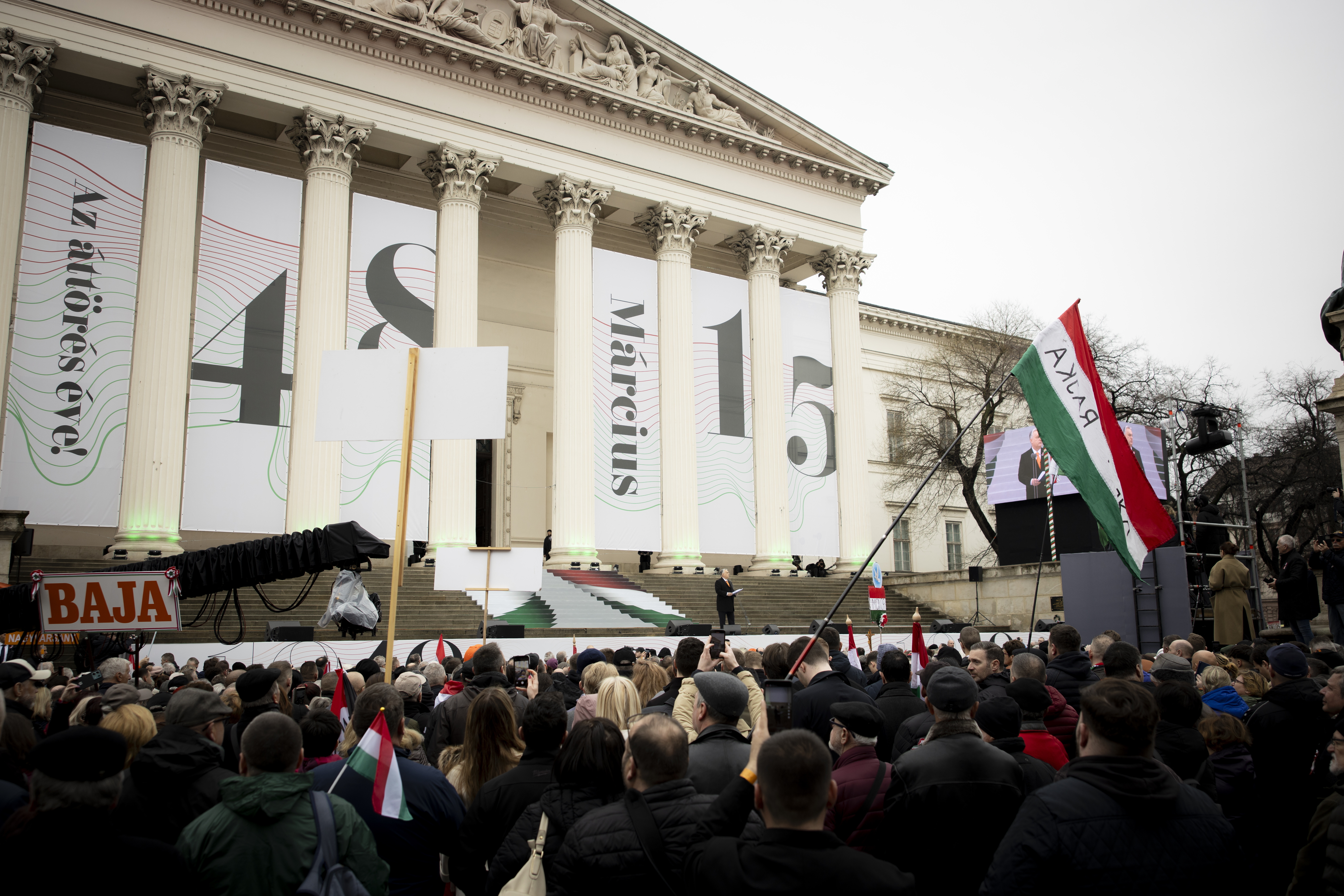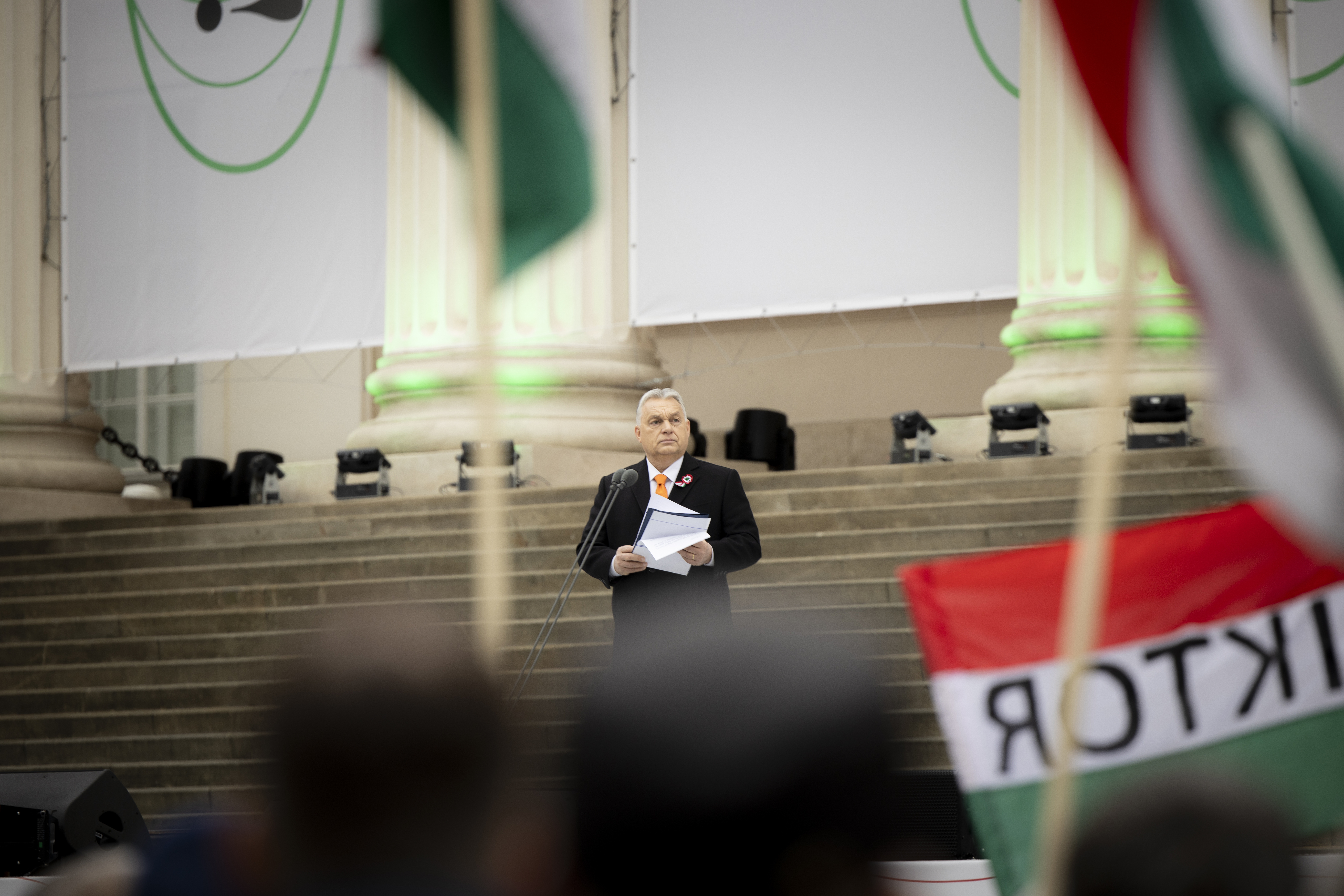 Orbán Viktor miniszterelnök beszédet mond az 1848/49-es forradalom és szabadságharc 177. évfordulója alkalmából tartott állami díszünnepségen a Múzeumkertben 2025. március 15-én. Fotó: MTI