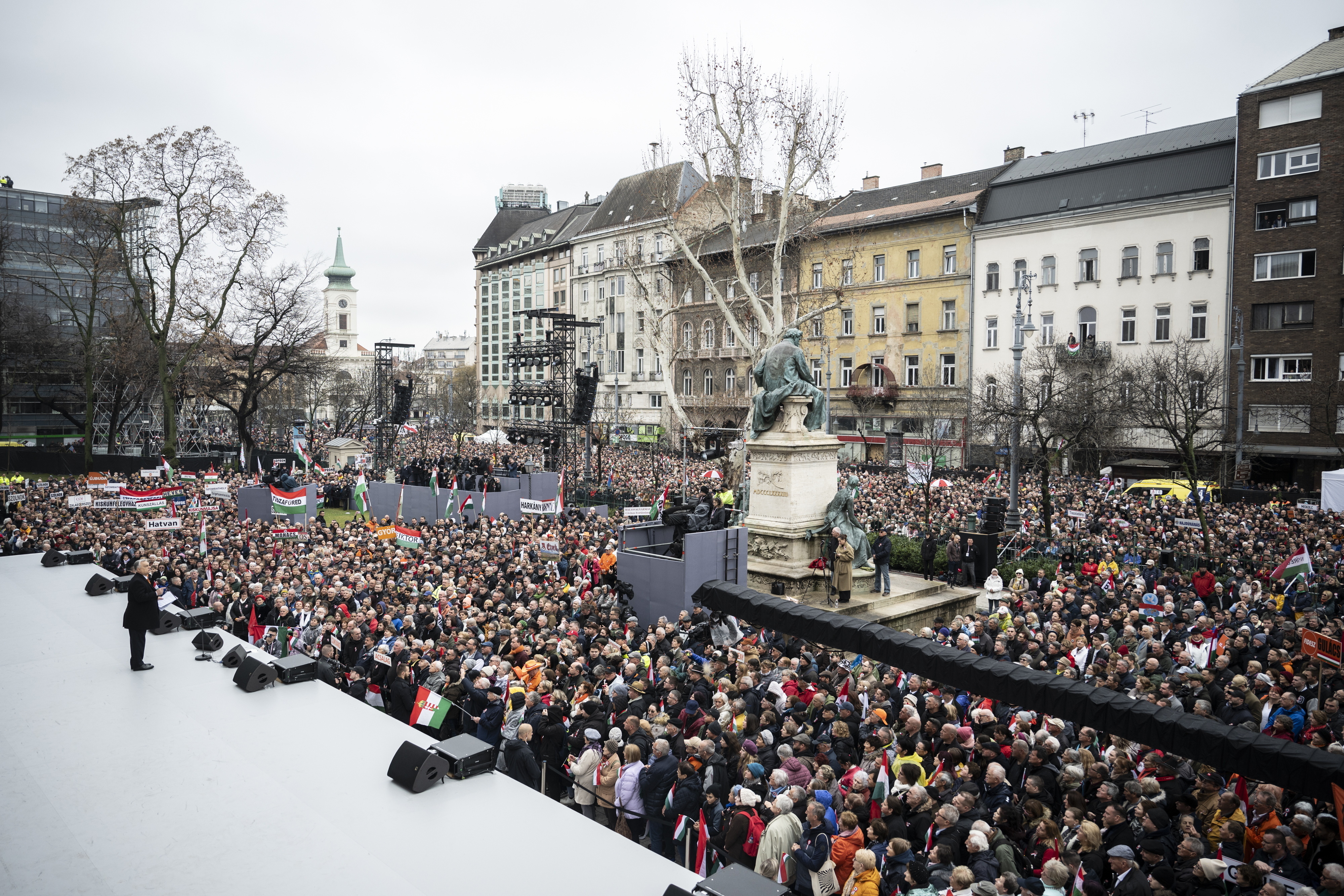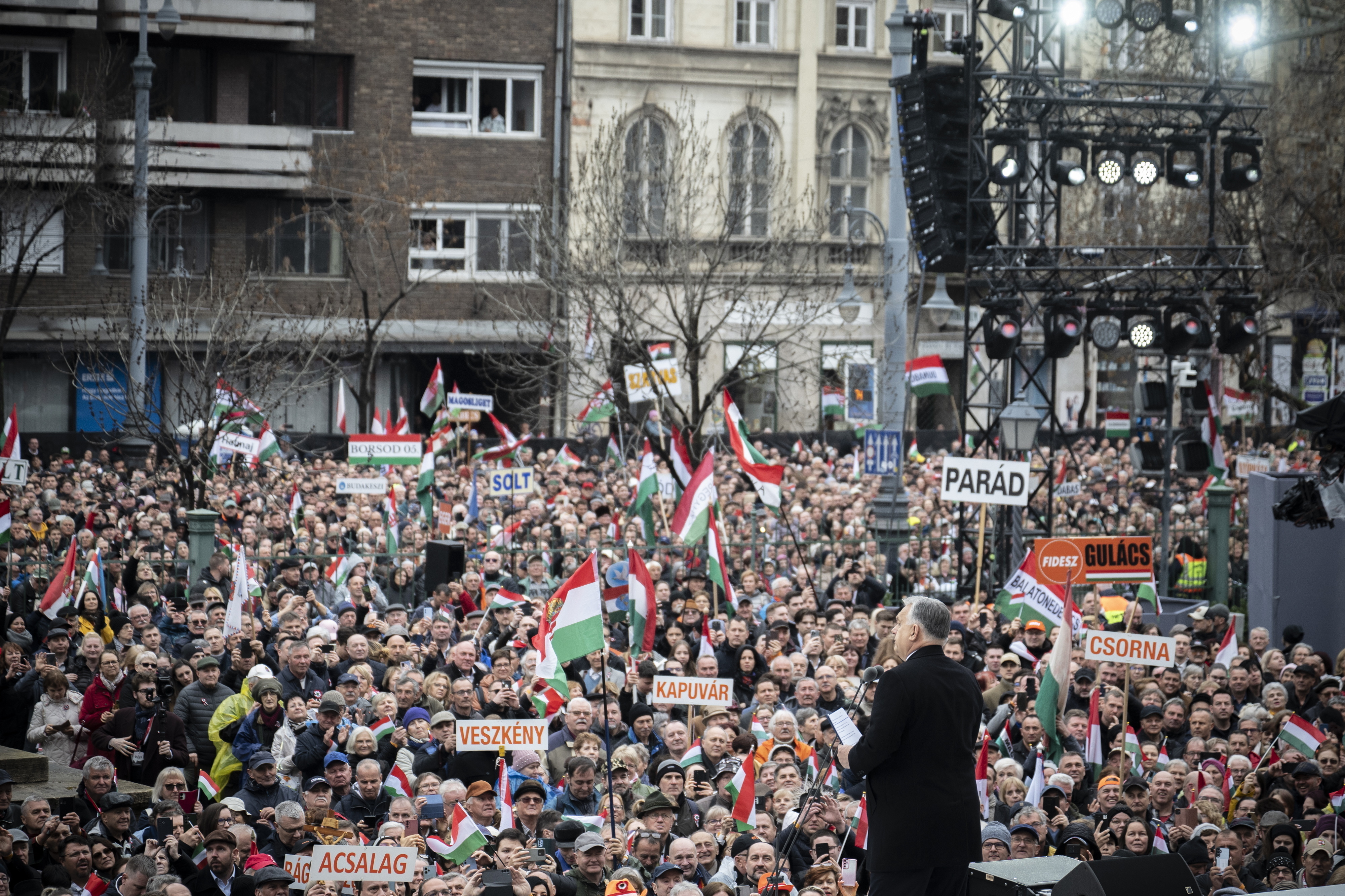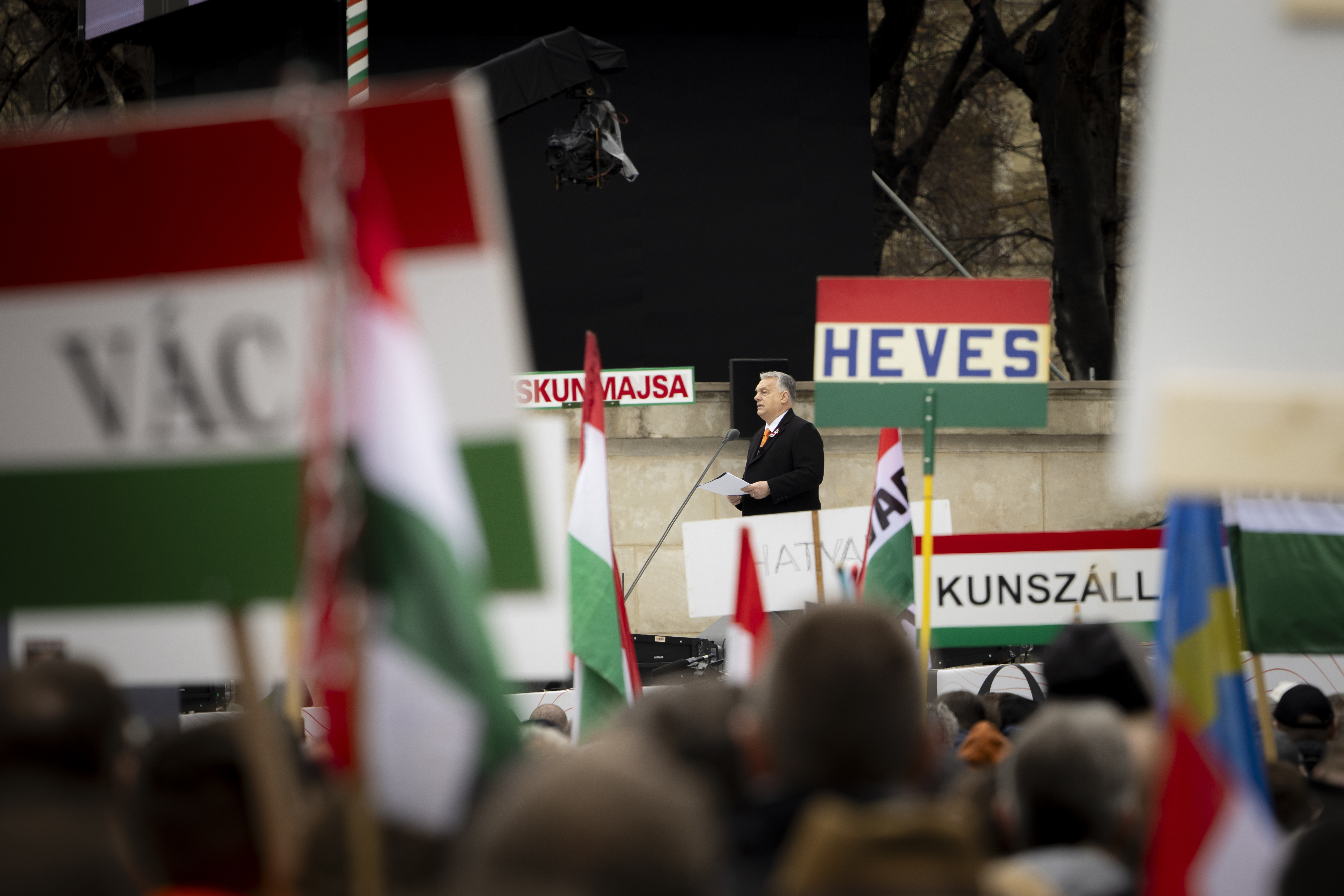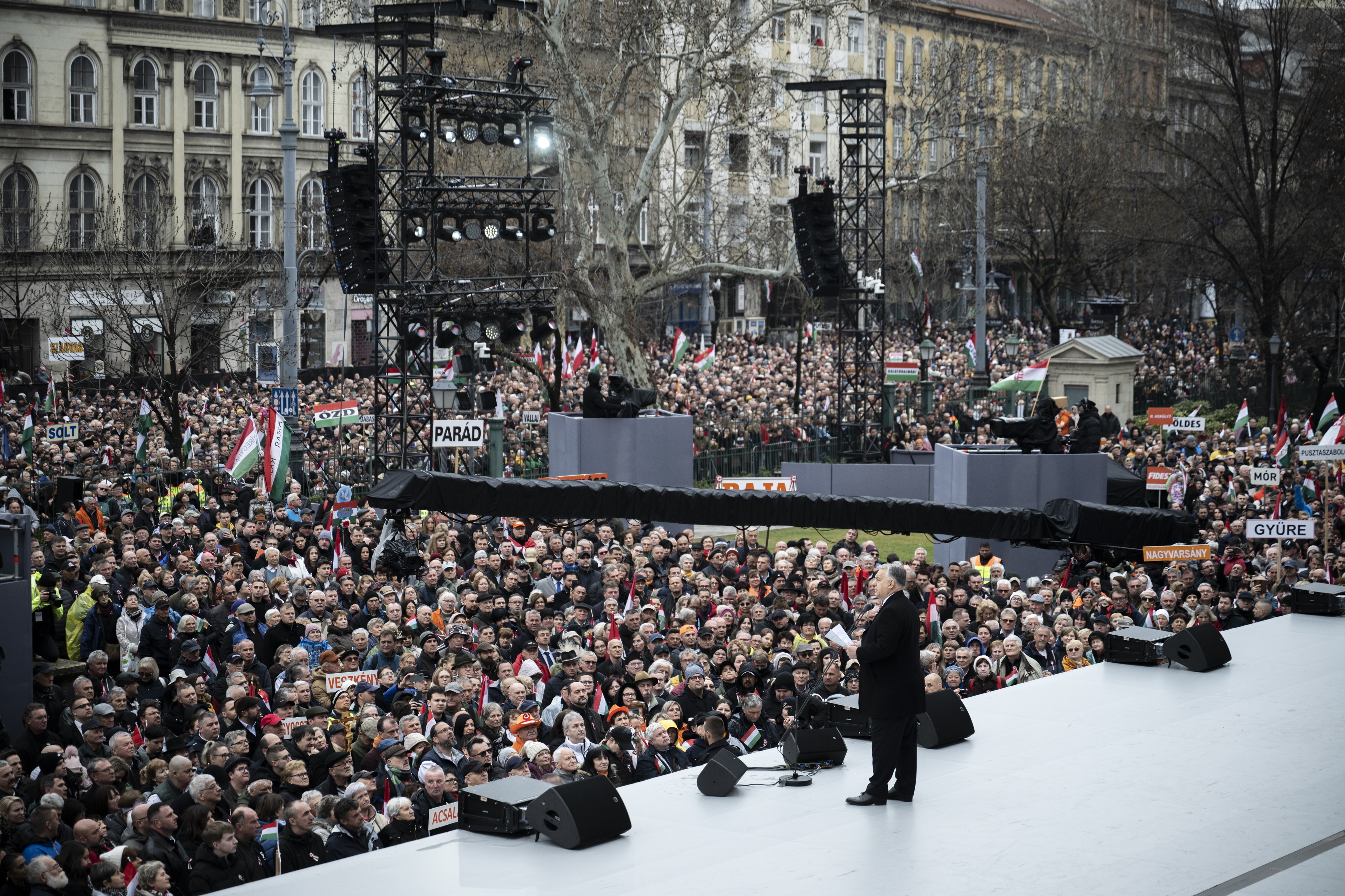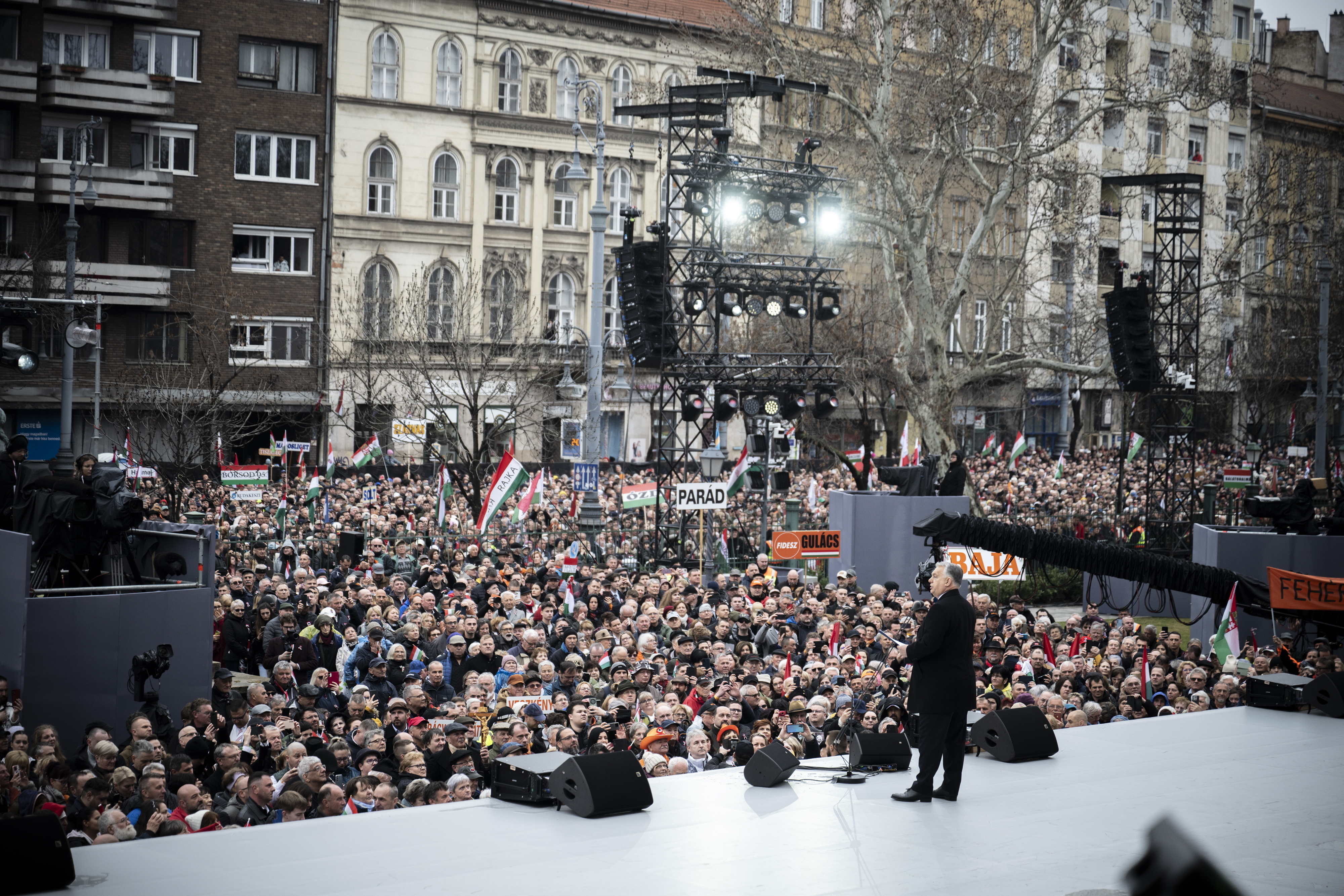 Orbán Viktor miniszterelnök beszédet mond az 1848/49-es forradalom és szabadságharc 177. évfordulója alkalmából tartott állami díszünnepségen a Múzeumkertben 2025. március 15-én. Fotó: MTI