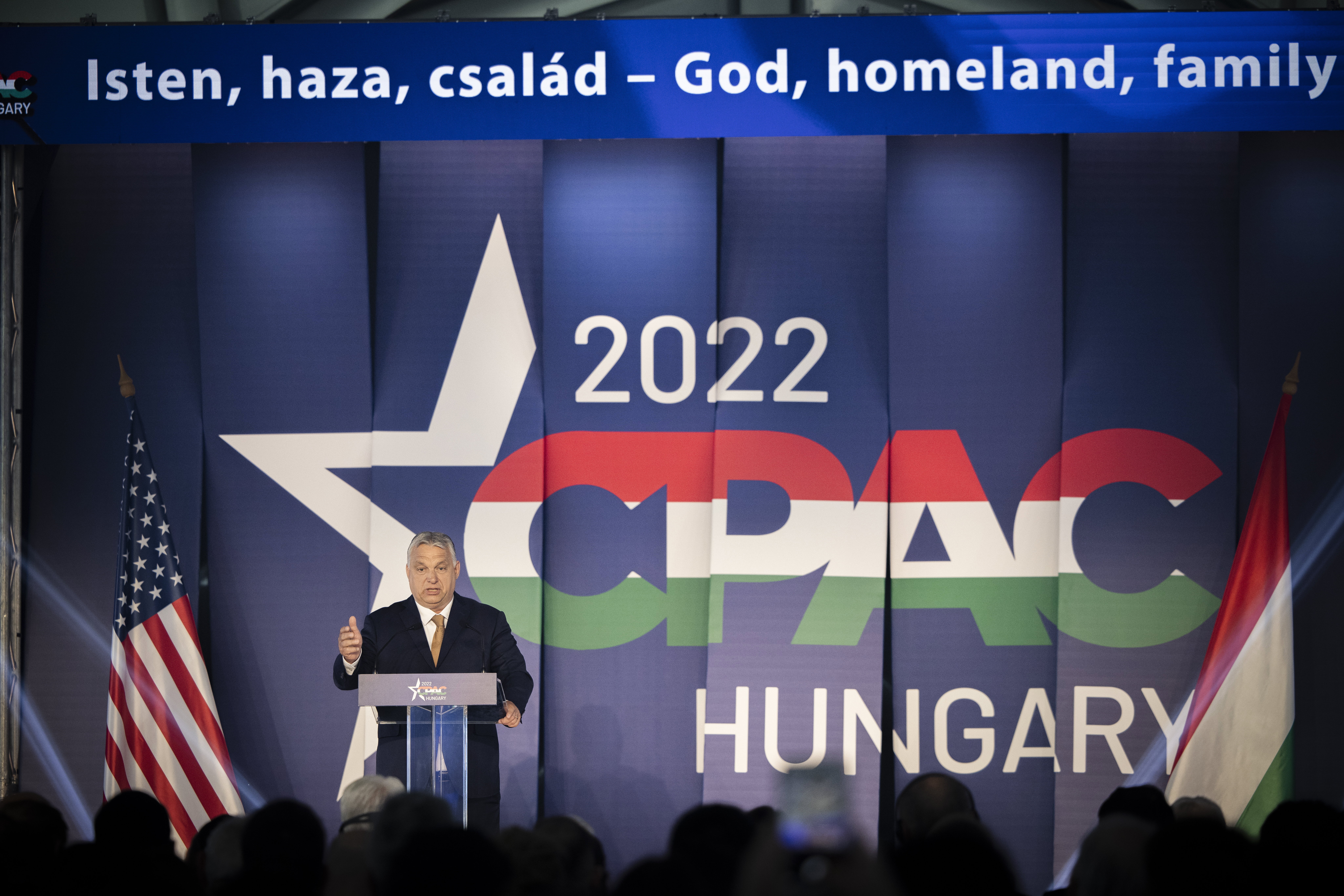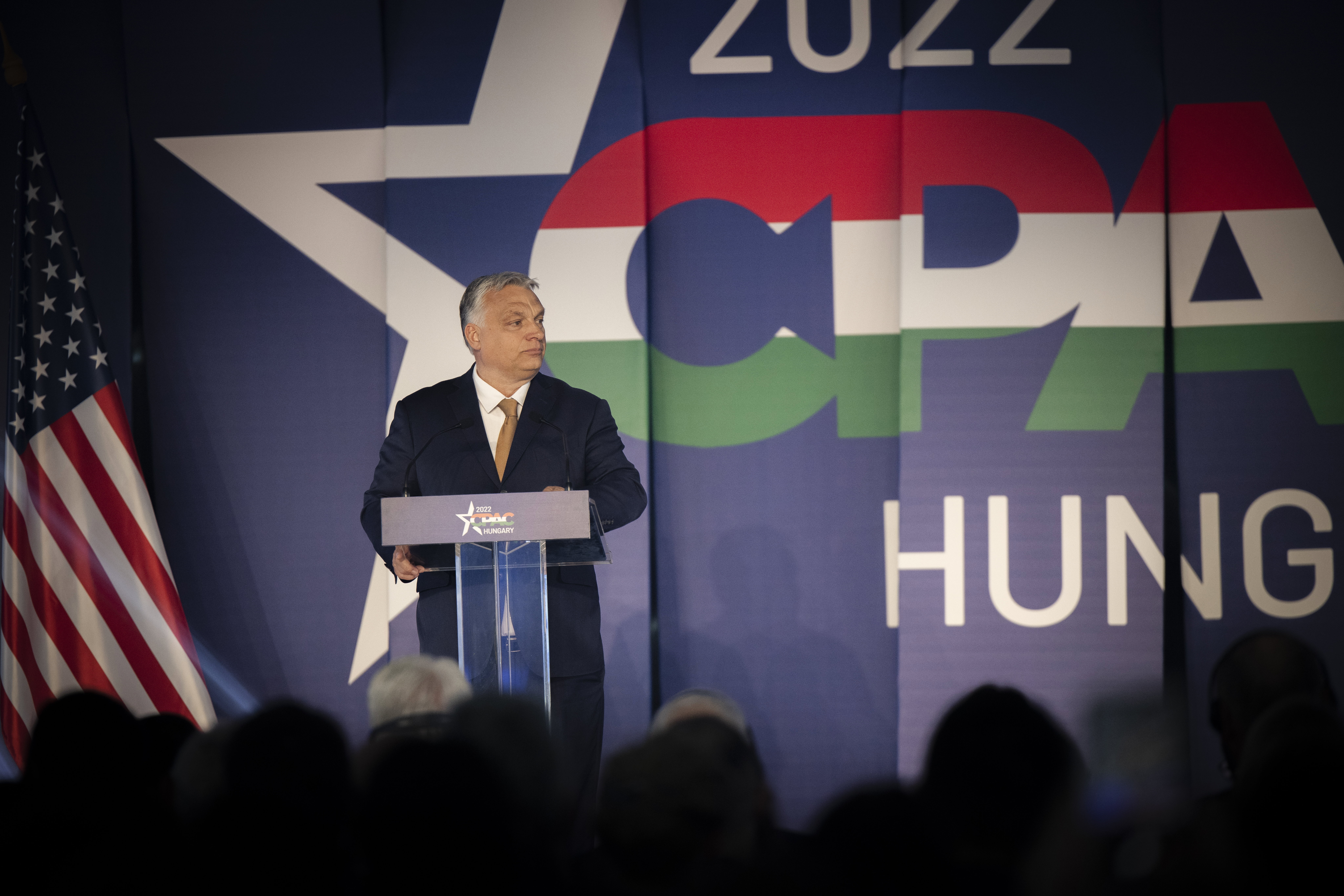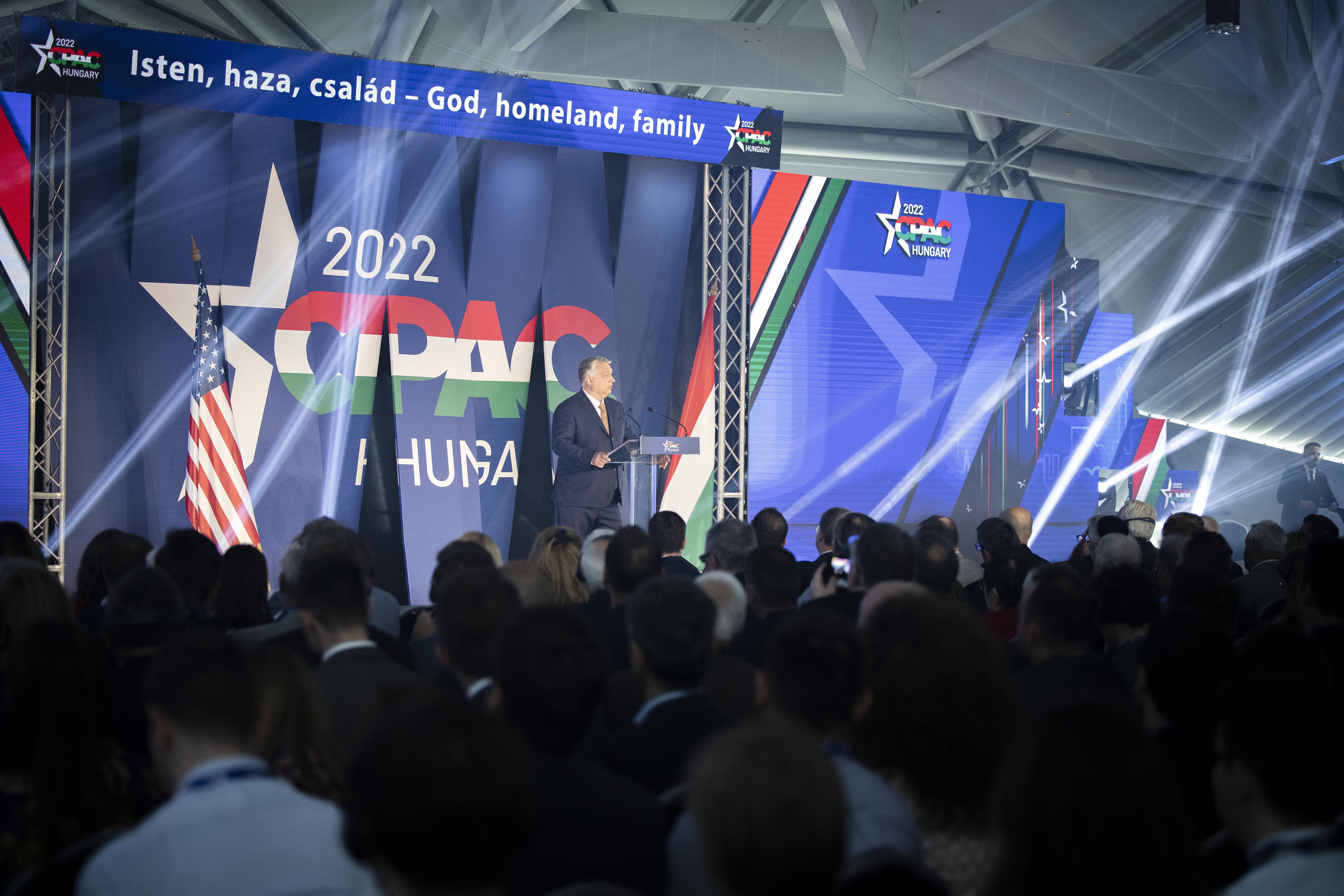 Orbán Viktor miniszterelnök, az esemény főszónoka a Conservative Political Action Conference (CPAC) Hungary elnevezésű, kétnapos konzervatív politikai fórum első napján a Bálna Budapestben 2022. május 19-én. Fotó: MTI/Miniszterelnöki Sajtóiroda/Fischer Zoltán