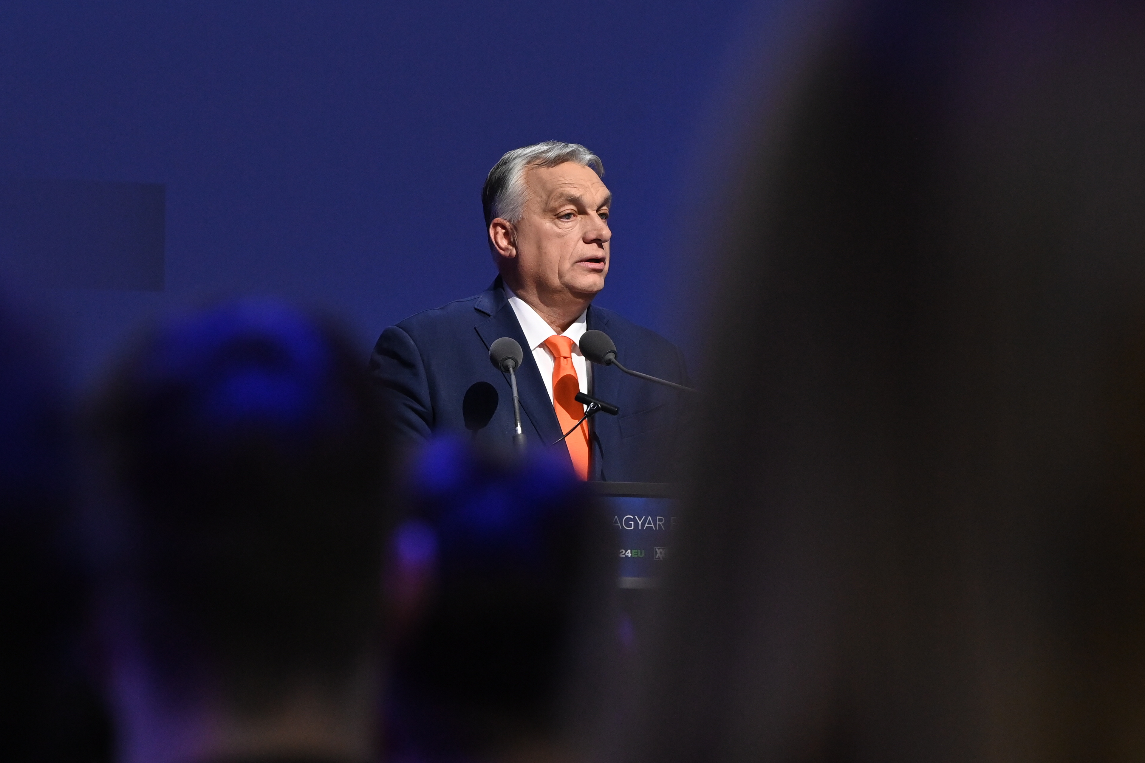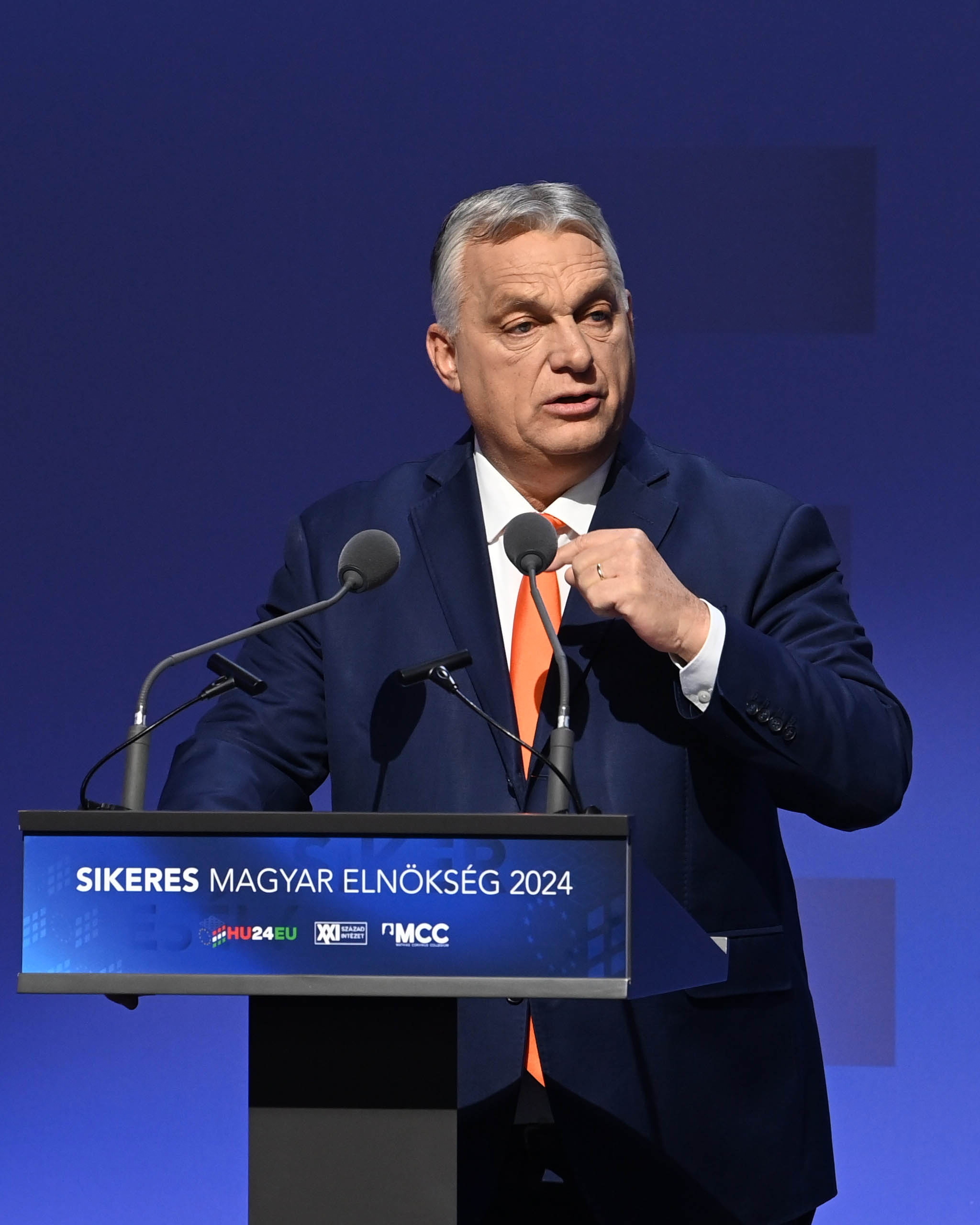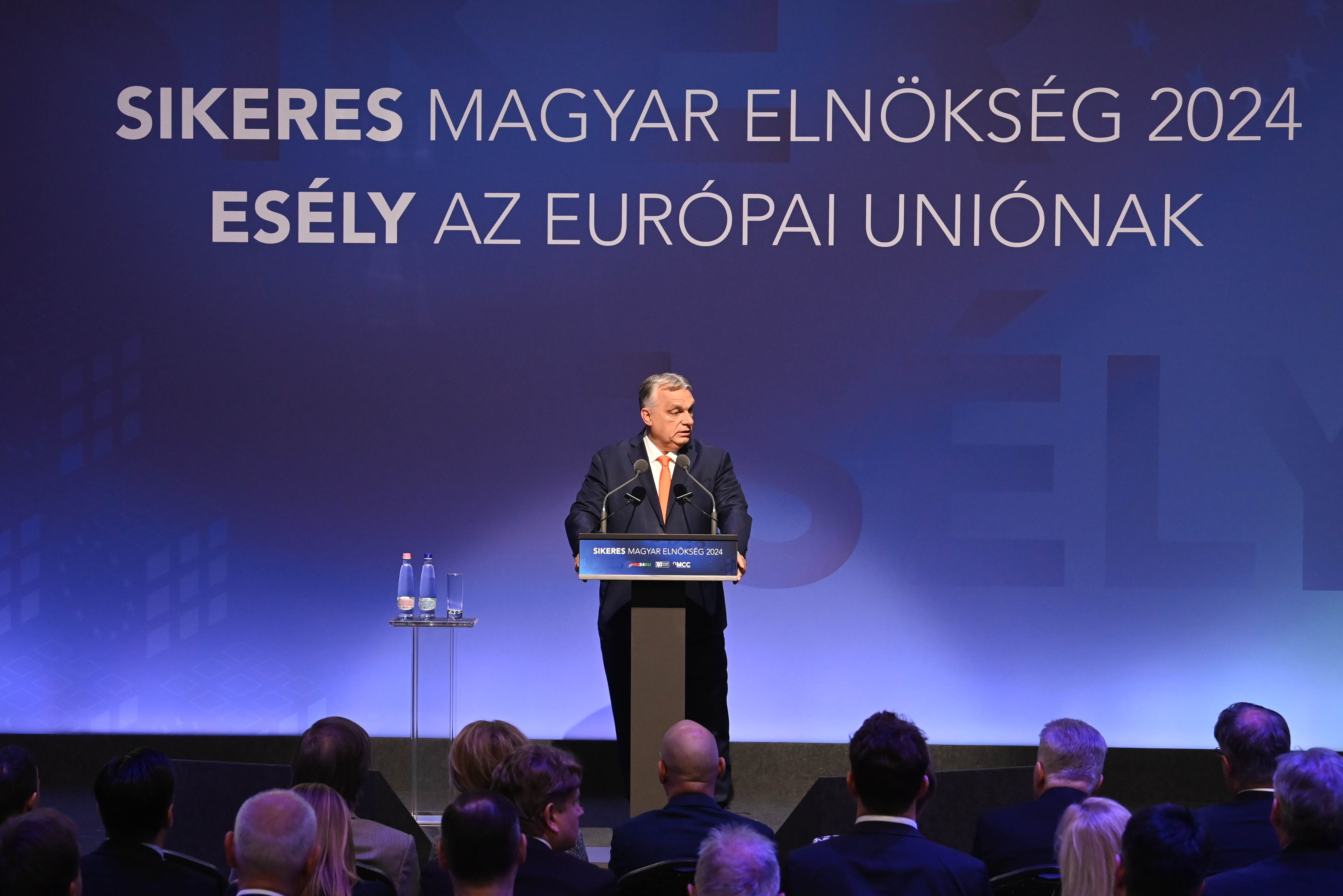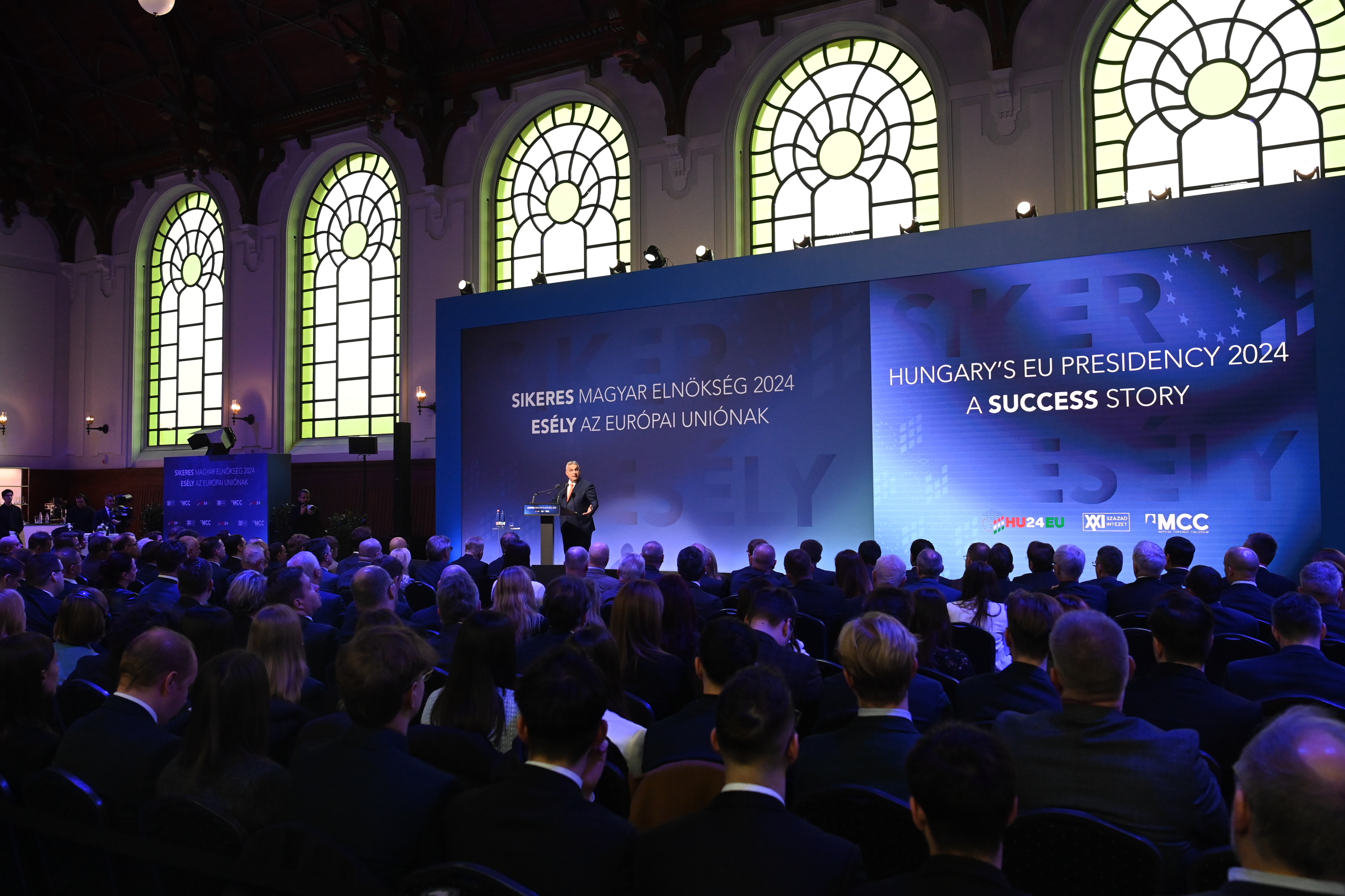 Orbán Viktor miniszterelnök beszédet mond a XXI. Század Intézet és a Mathias Corvinus Collegium Sikeres magyar elnökség 2024 - Esély az Európai Uniónak című budapesti konferenciáján 2025. január 20-án. Fotó: MTI/Máthé Zoltán