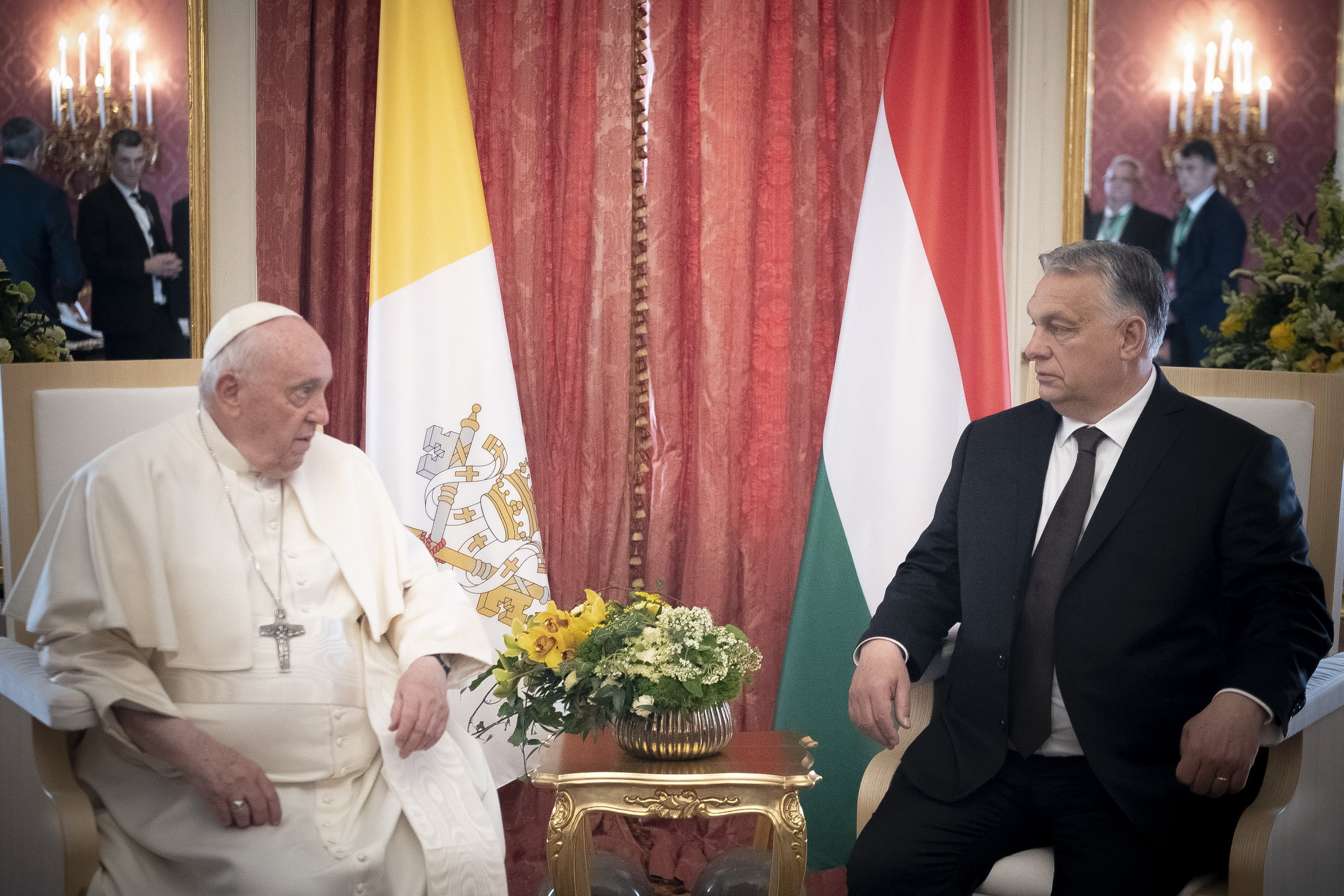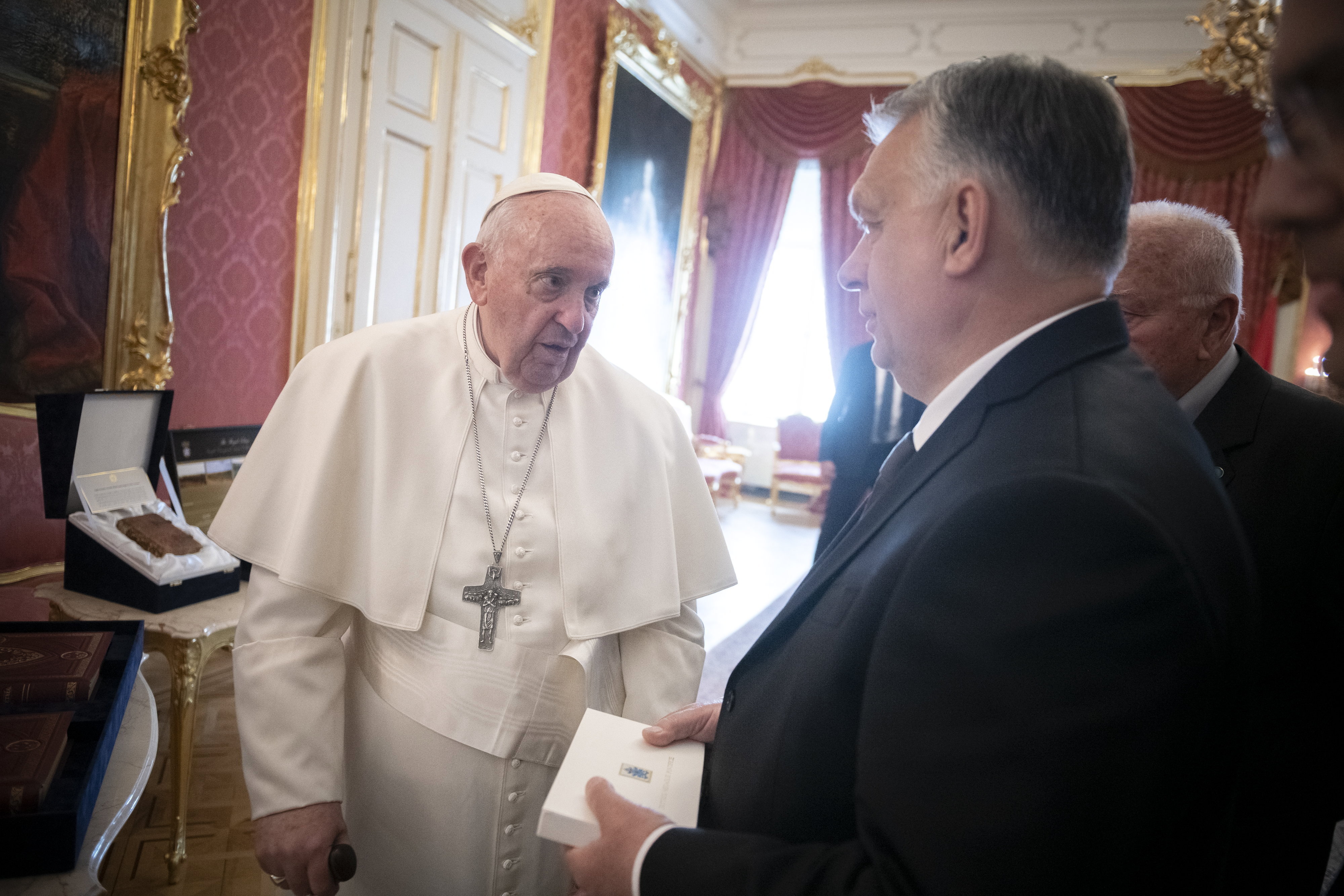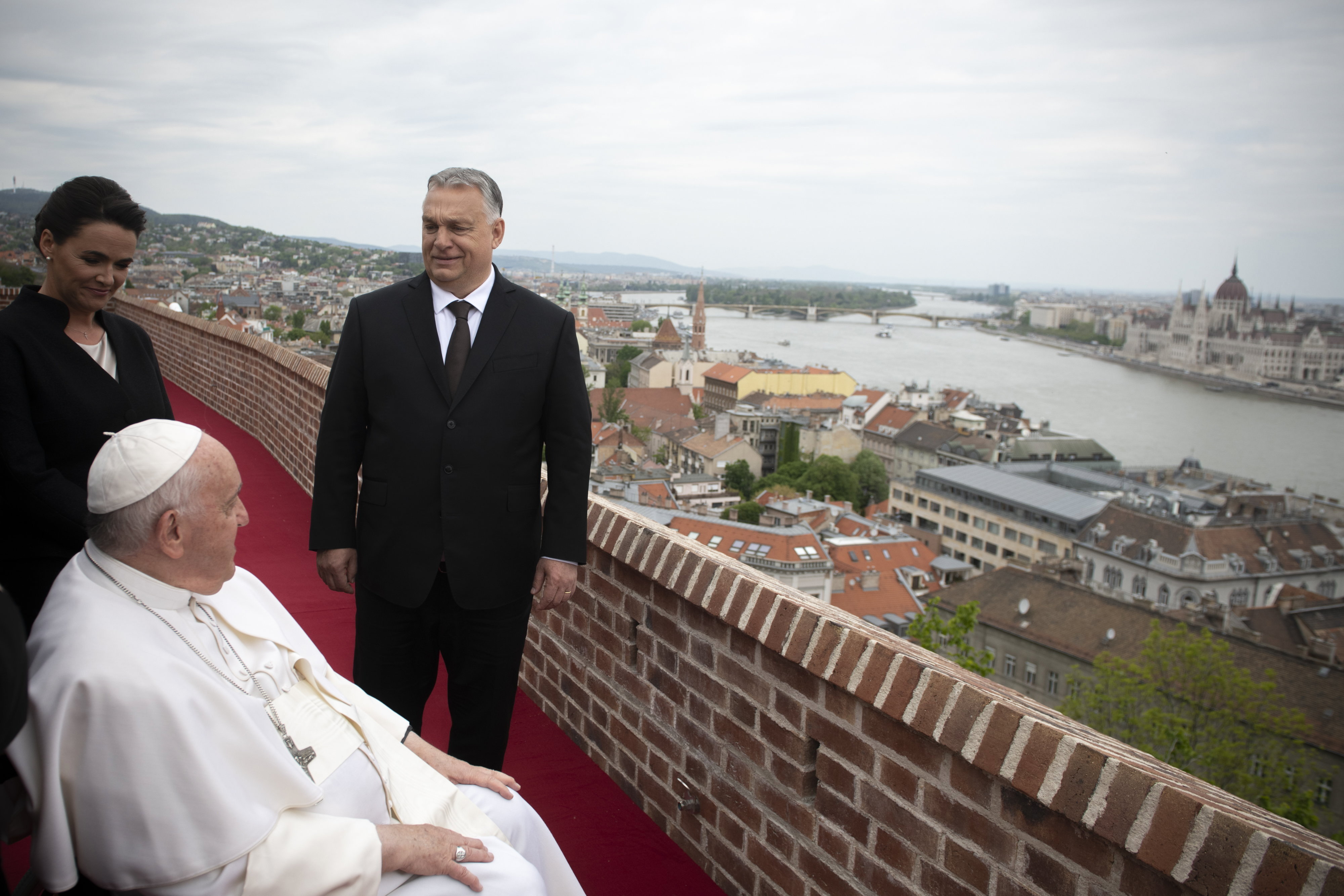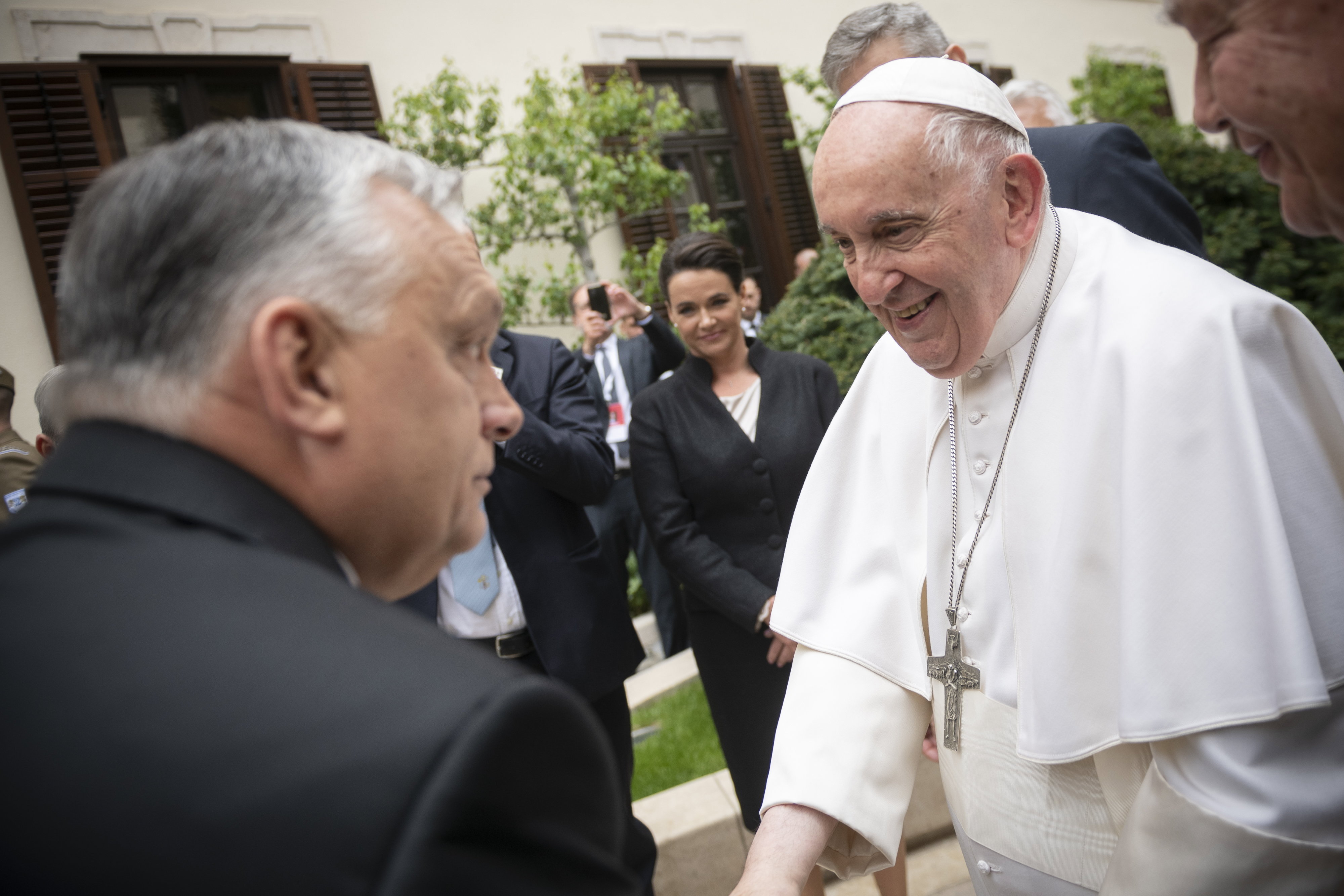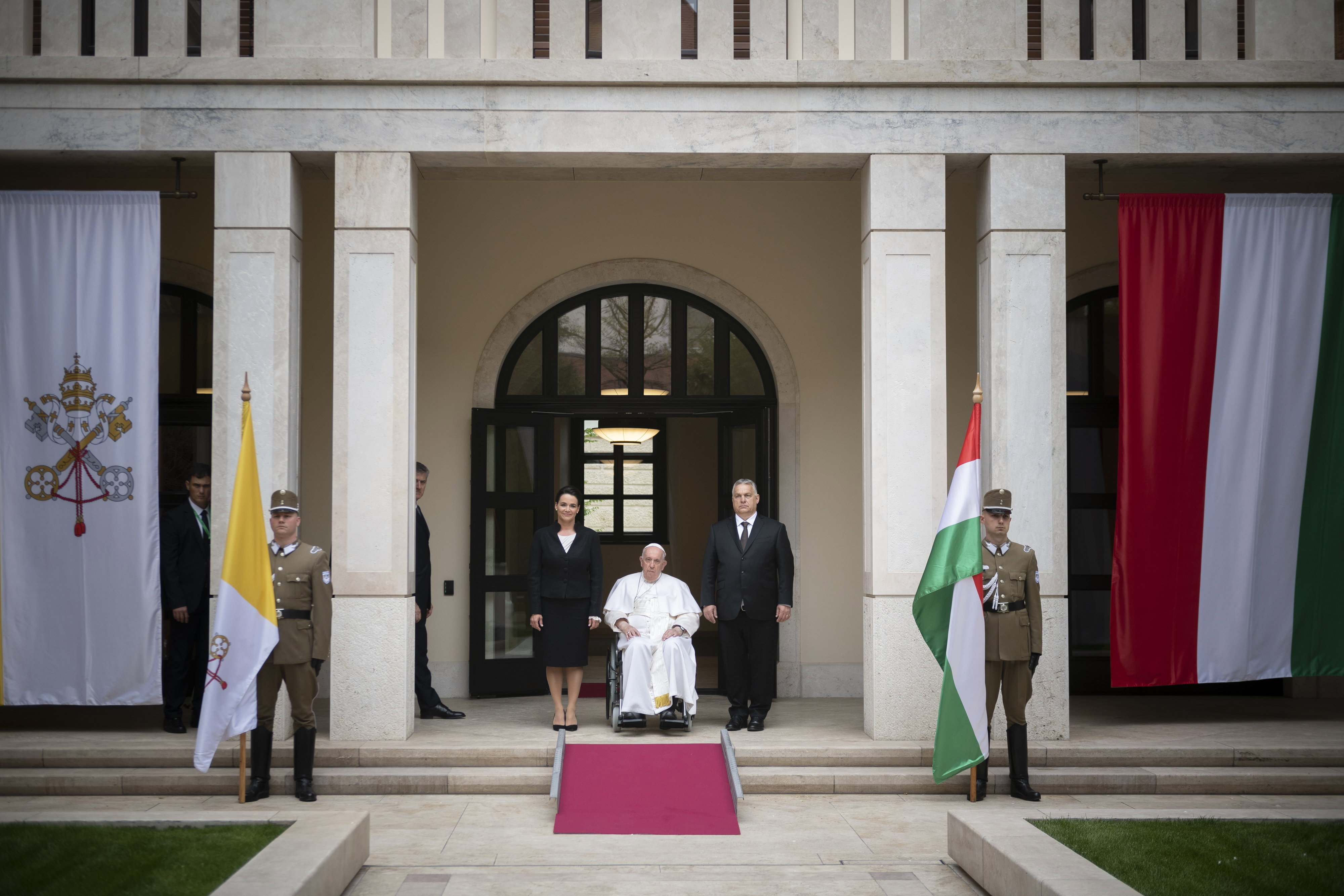 Orbán Viktor miniszterelnök fogadja Ferenc pápát Novák Katalin köztársasági elnök jelenlétében a Karmelita kolostorban 2023. április 28-án. A katolikus egyházfő háromnapos apostoli látogatásra érkezett Magyarországra. Fotó: Miniszterelnöki Sajtóiroda/Benko Vivien Cher