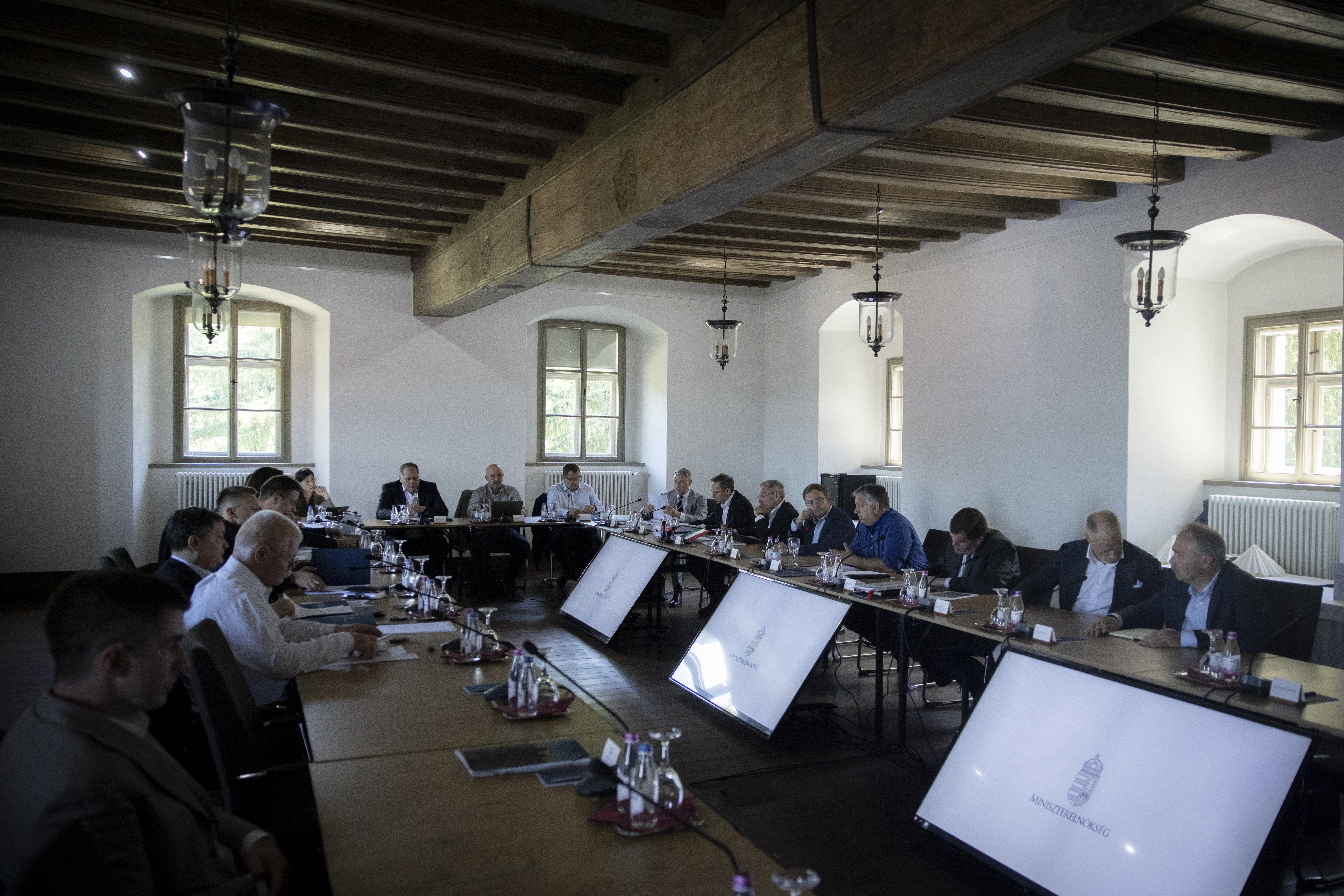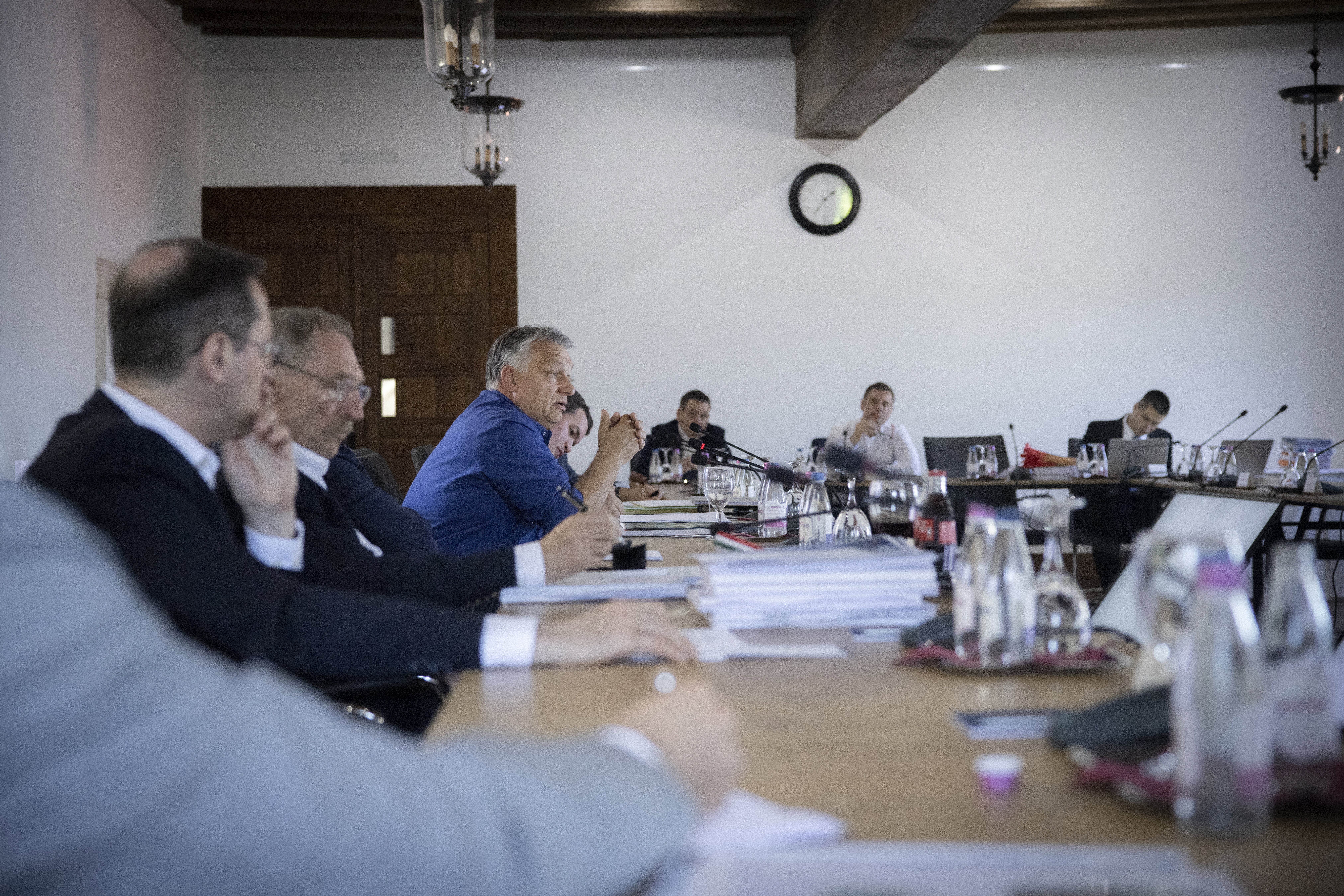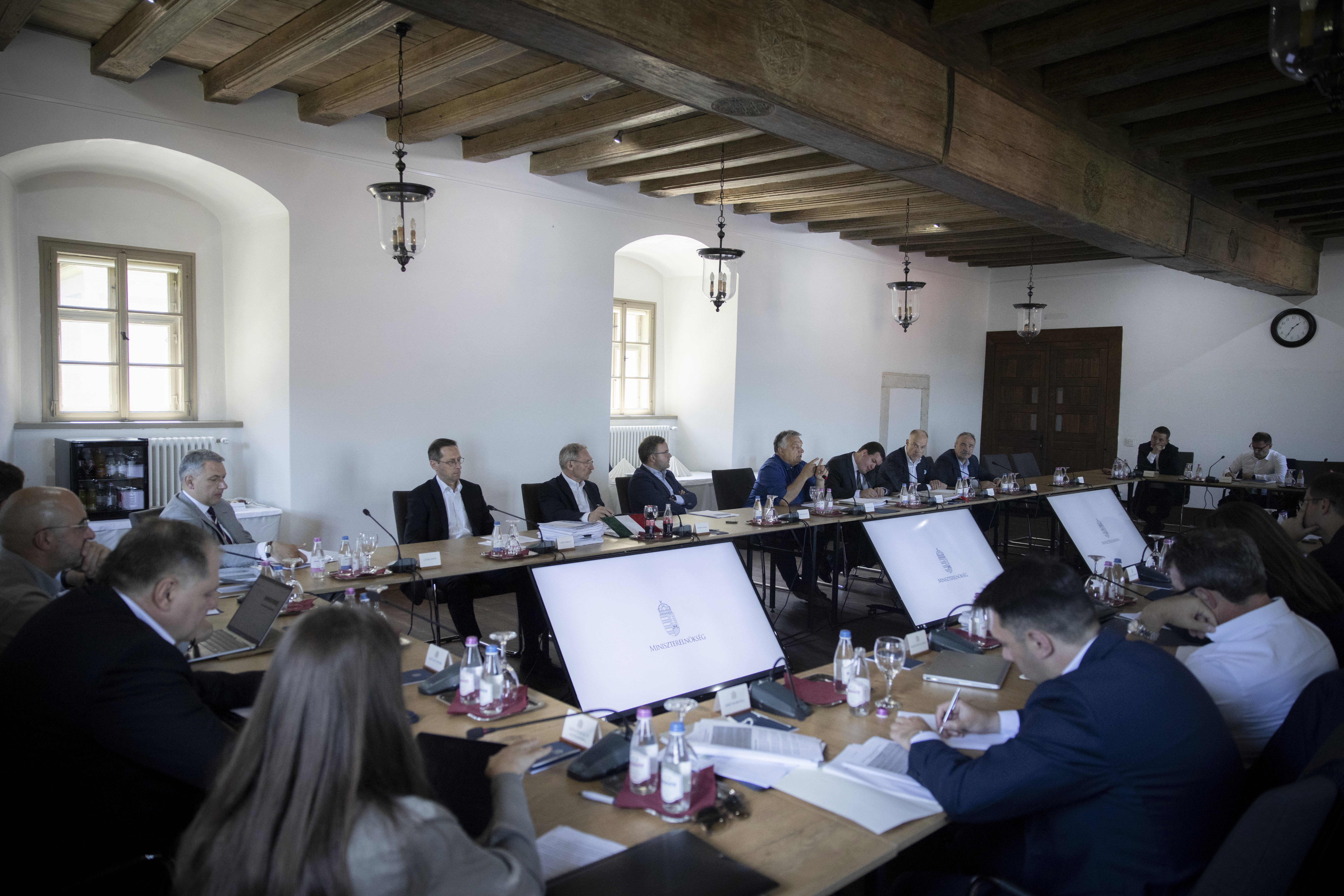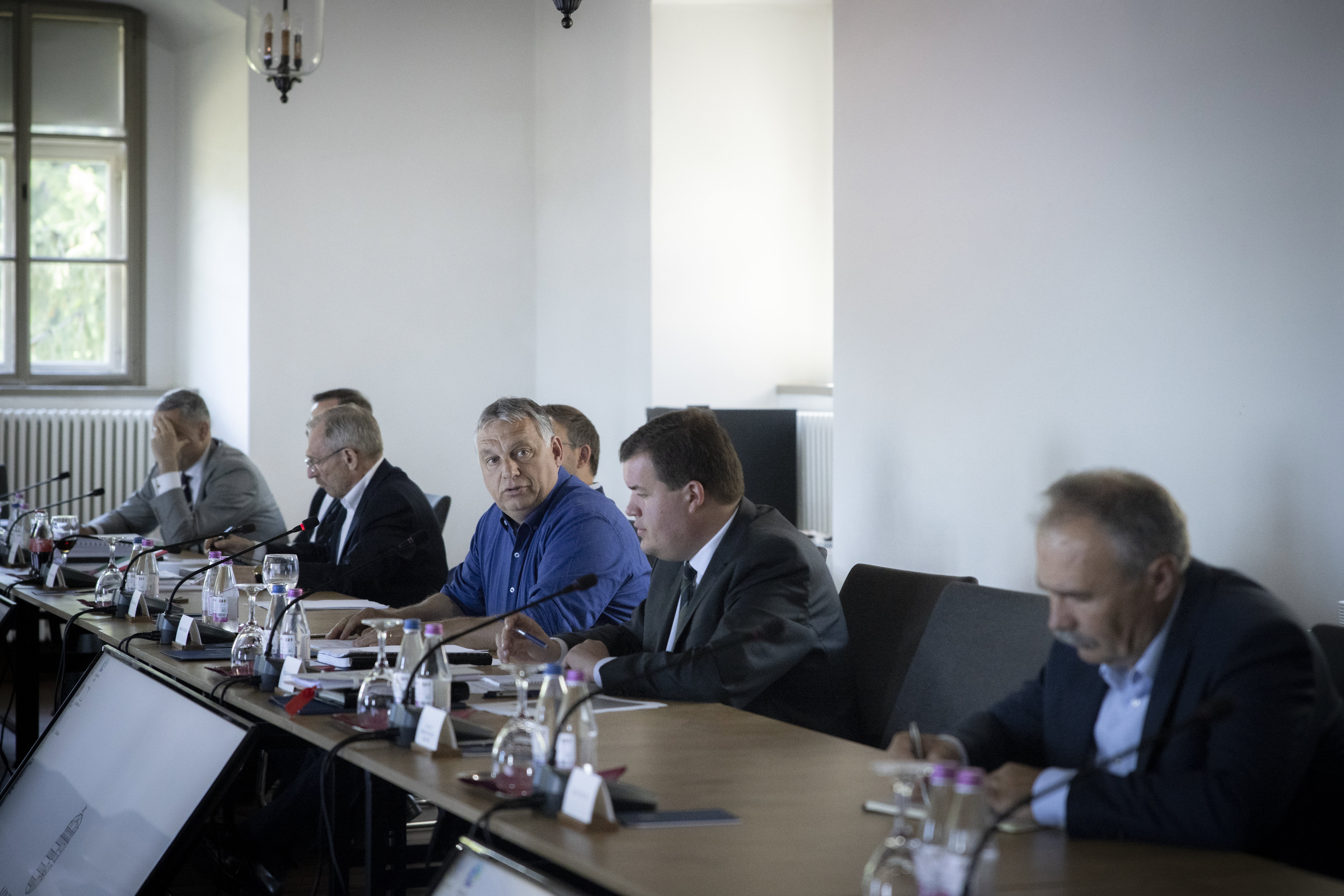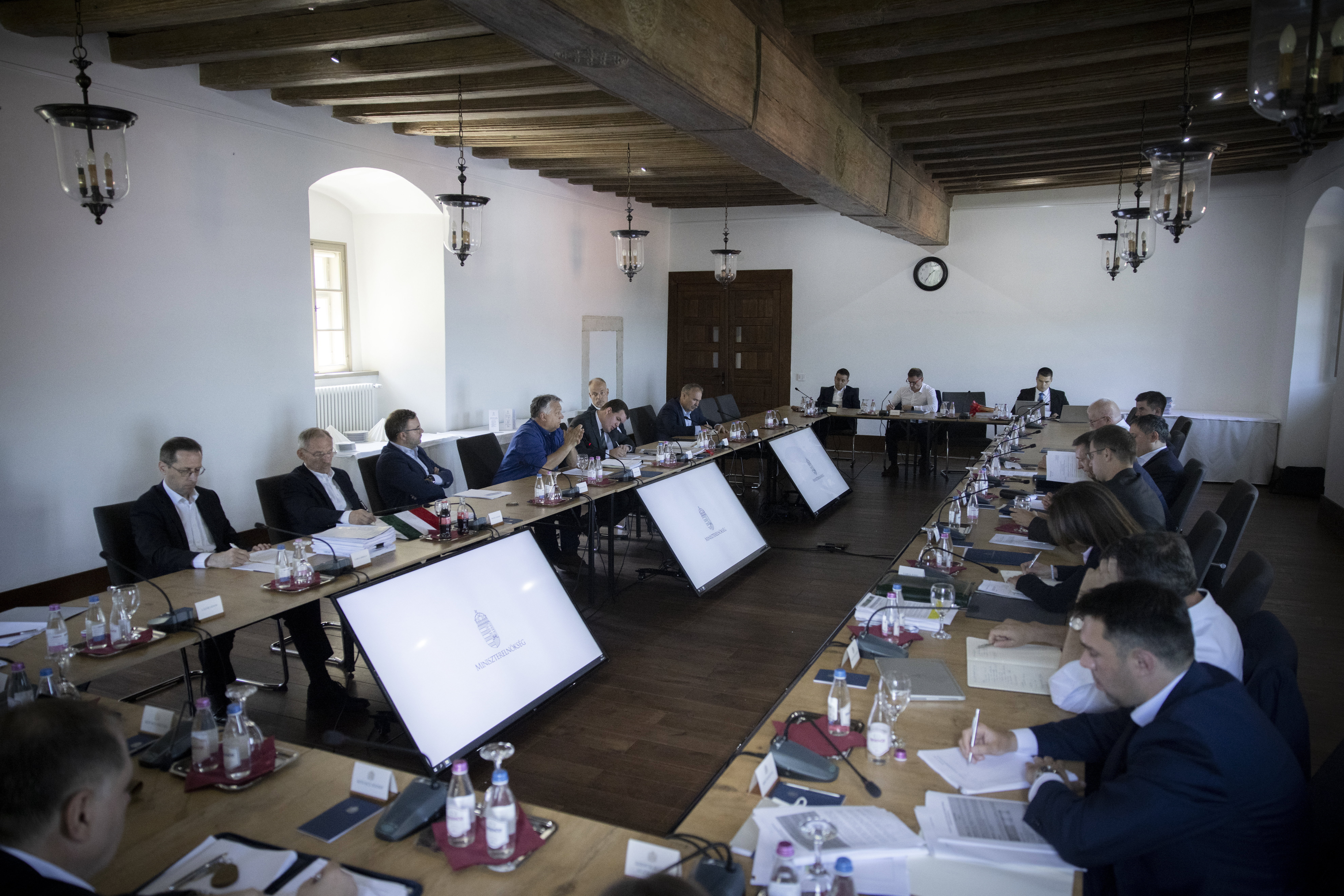 Orbán Viktor miniszterelnök a Sopronban tartott kihelyezett kormányülésen 2022. június 4-én. A kormányfő vezetésével három napos kihelyezett ülést tartott a kormány Sopronban, ahol elfogadták az extraprofit adó kivetéséről szóló rendelkezéseket és a 2023-as költségvetés tervezetét is. Fotó: MTI/Miniszterelnöki Sajtóiroda/Fischer Zoltán