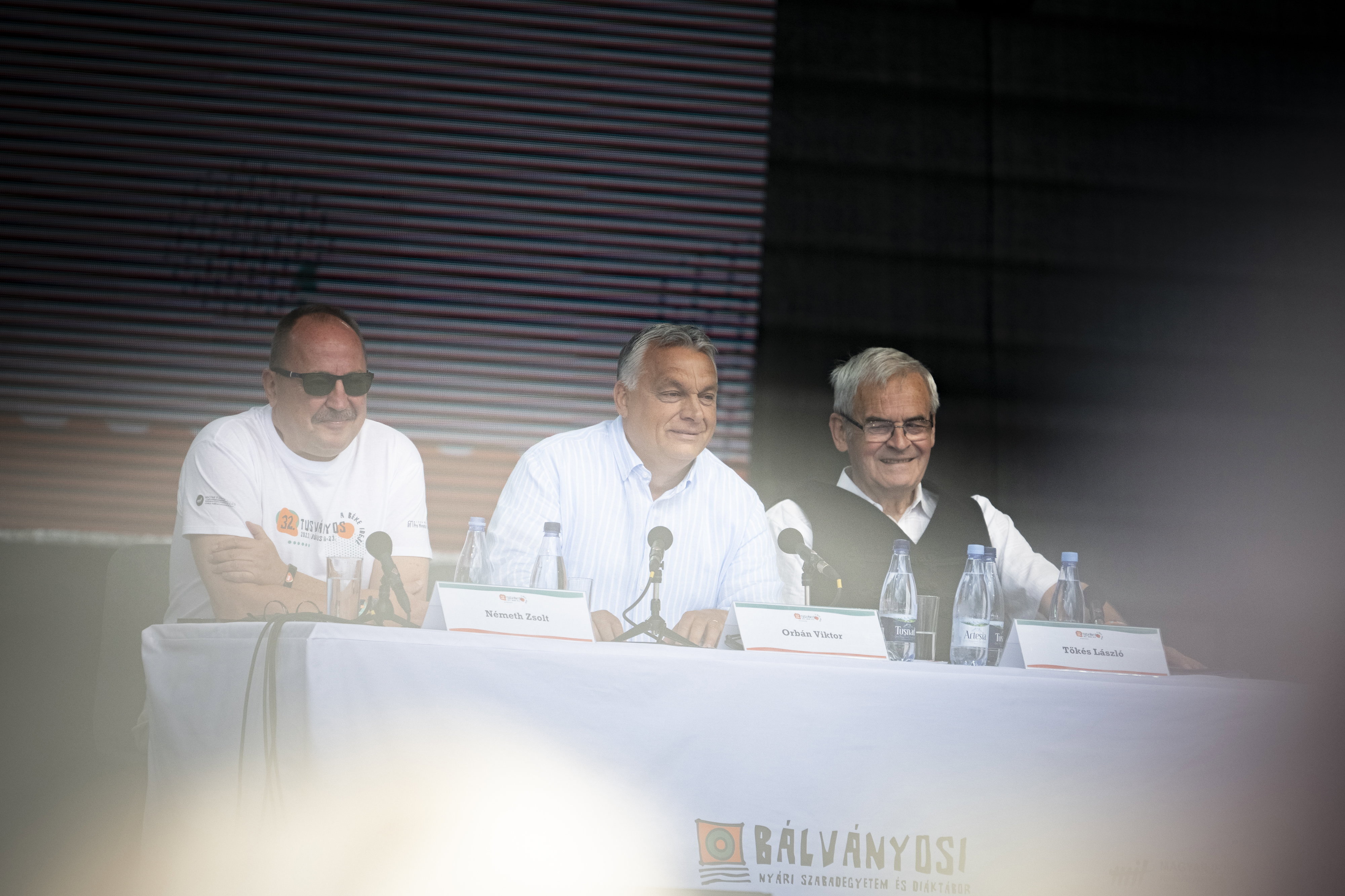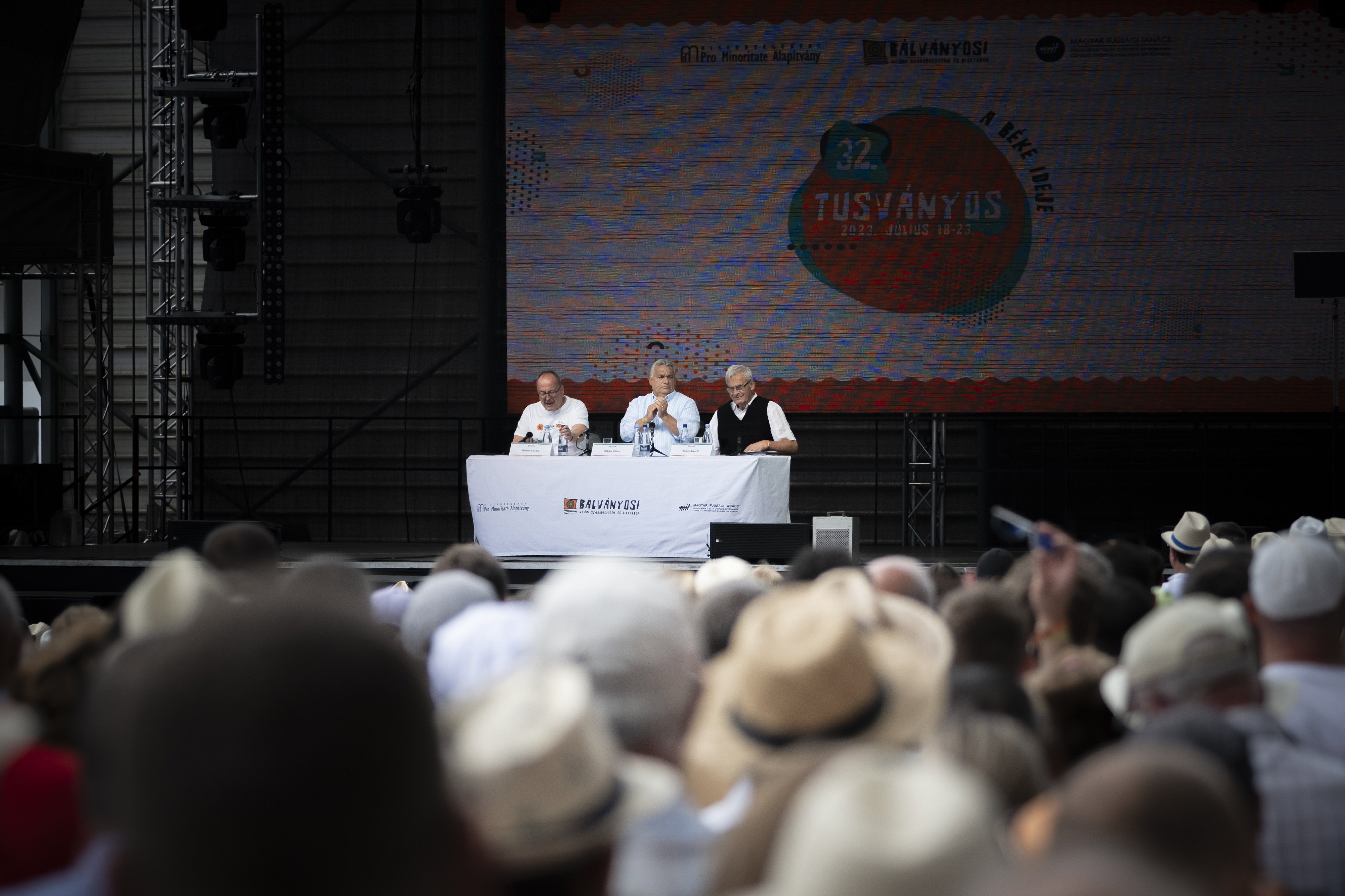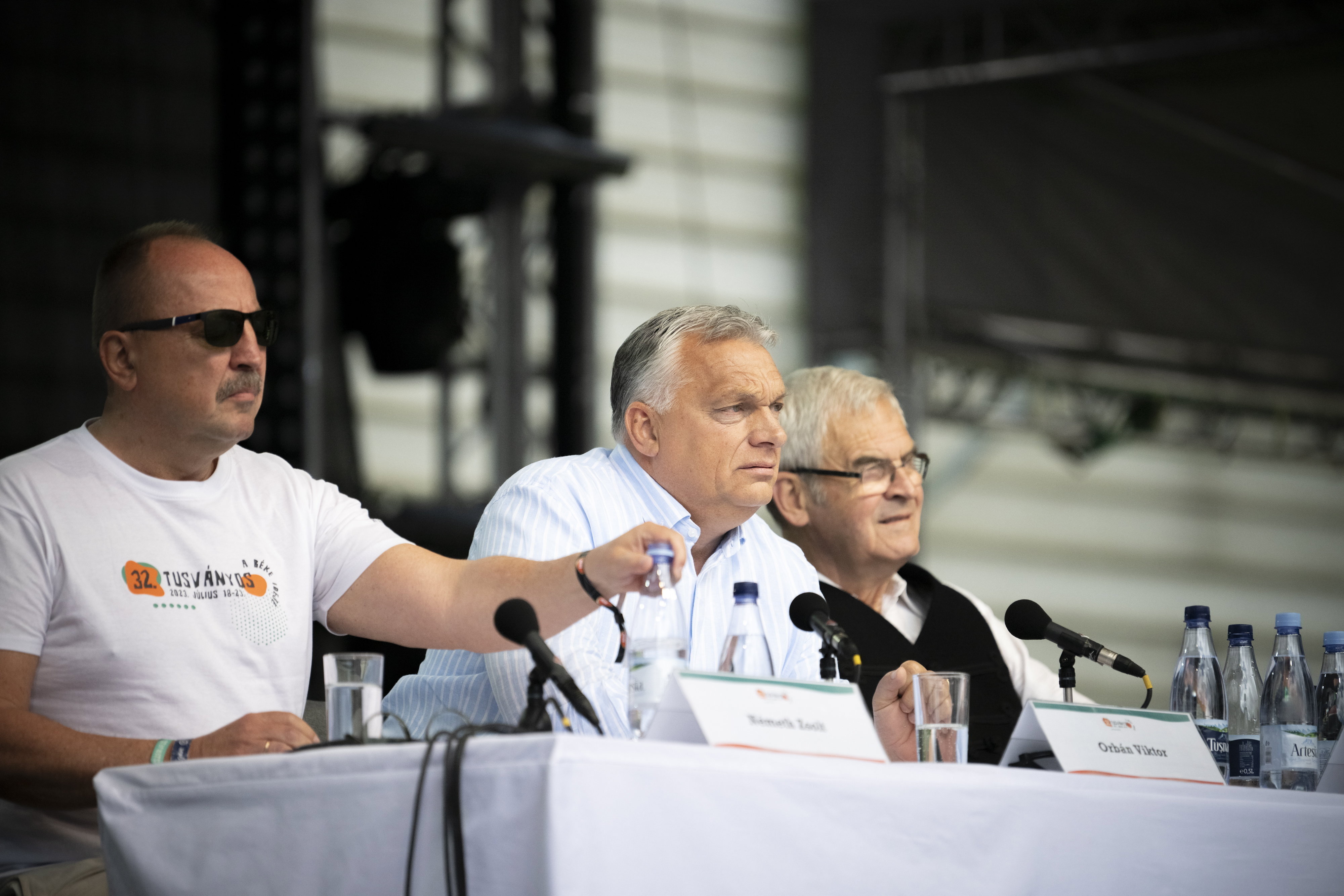 Orbán Viktor kormányfő előadást tart a 32. Bálványosi Nyári Szabadegyetem és Diáktáborban az erdélyi Tusnádfürdőn 2023. július 22-én. Mellette Németh Zsolt, az Országgyűlés külügyi bizottságának fideszes elnöke és Tőkés László, az Erdélyi Magyar Nemzeti Tanács (EMNT) elnöke . Fotó: Miniszterelnöki Sajtóiroda/Benko Vivien Cher