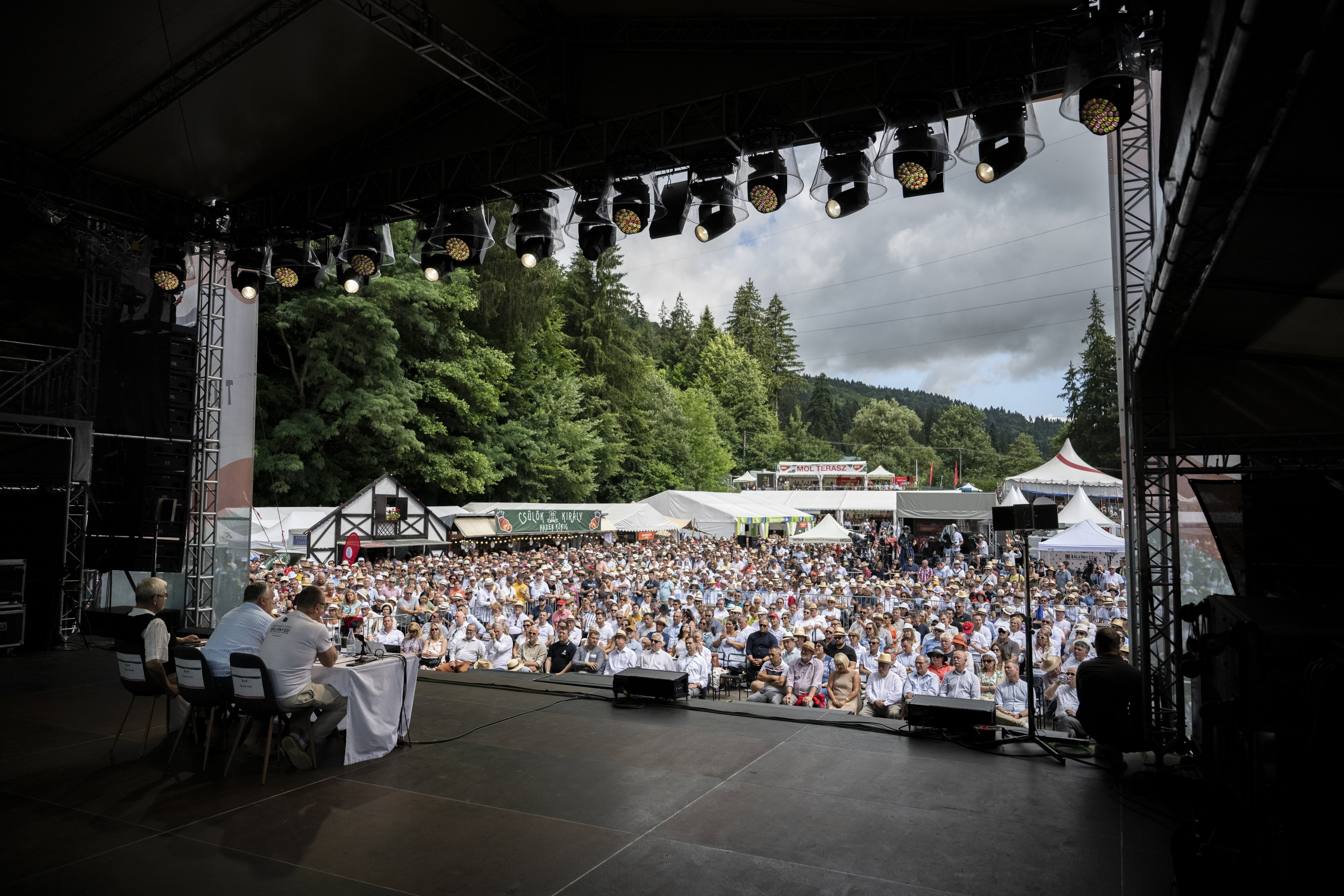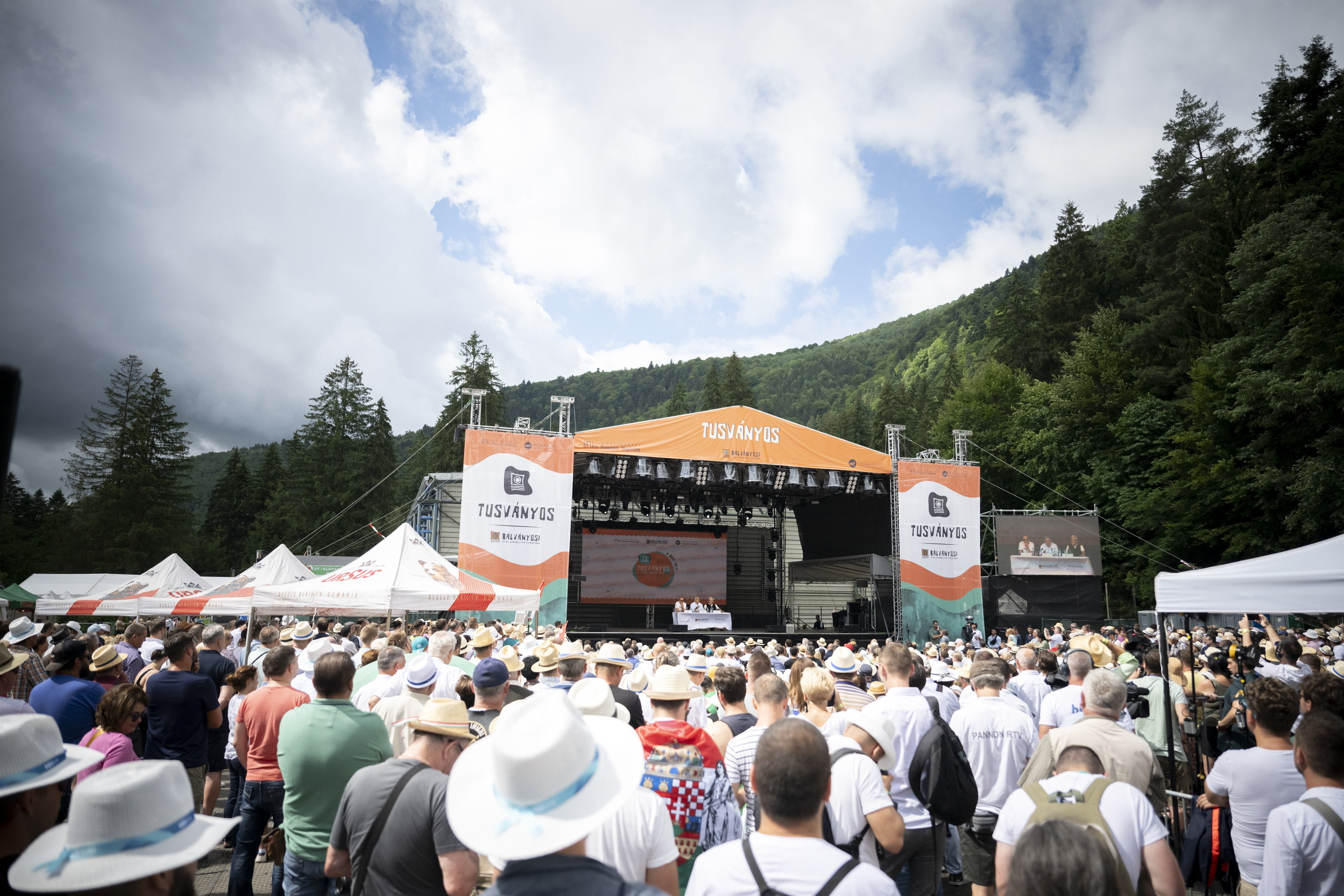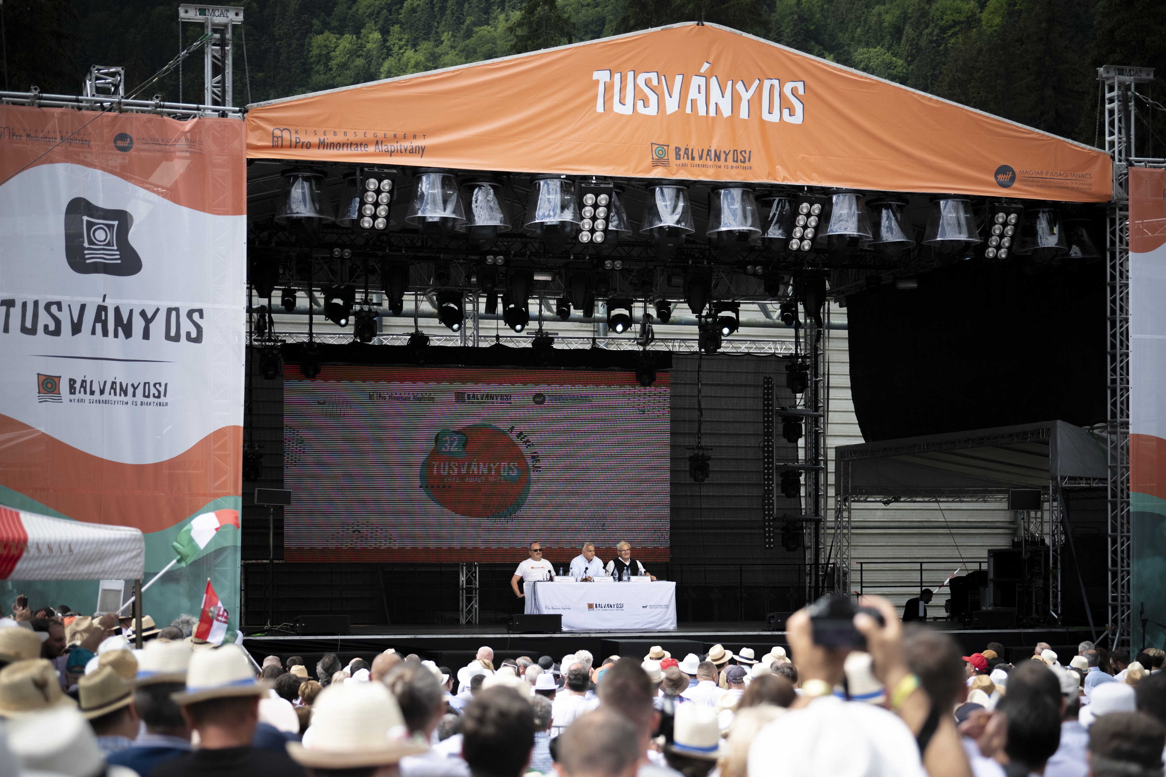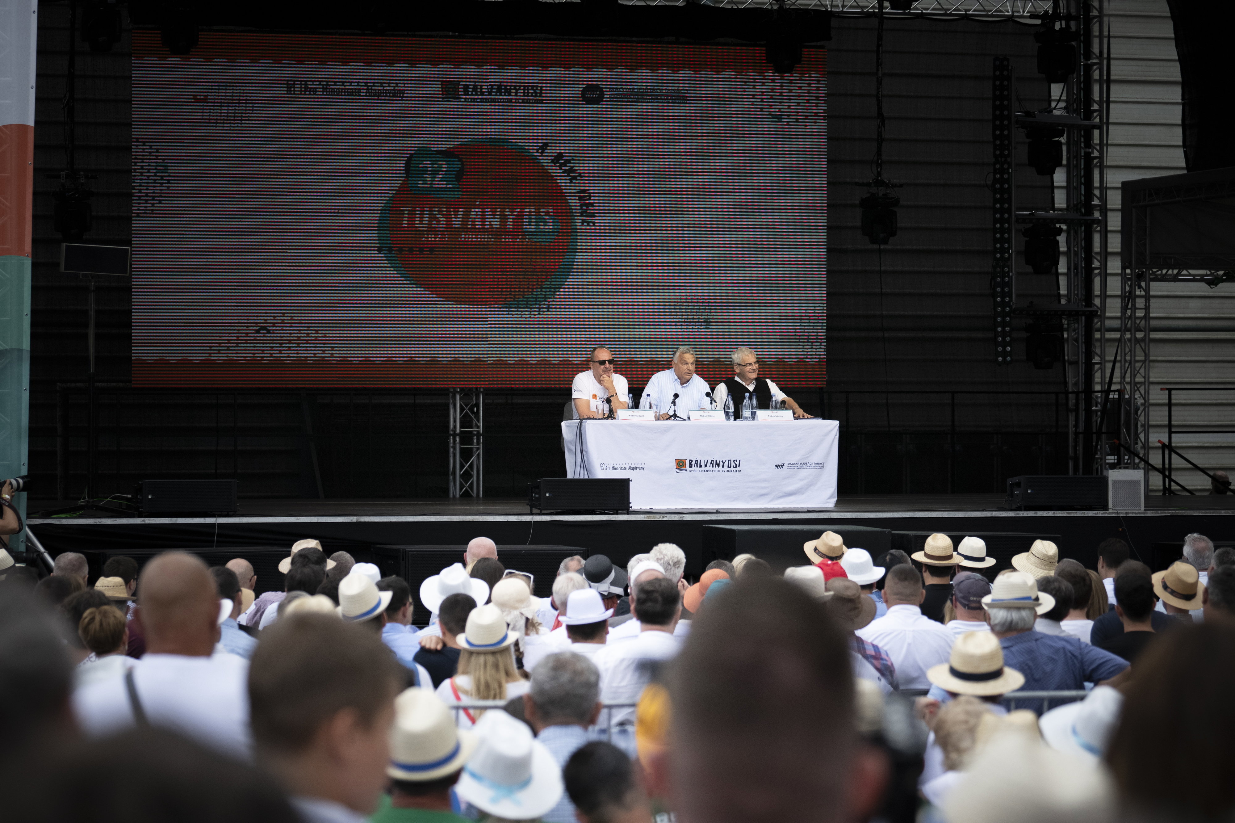 Orbán Viktor kormányfő előadást tart a 32. Bálványosi Nyári Szabadegyetem és Diáktáborban az erdélyi Tusnádfürdőn 2023. július 22-én. Mellette Németh Zsolt, az Országgyűlés külügyi bizottságának fideszes elnöke és Tőkés László, az Erdélyi Magyar Nemzeti Tanács (EMNT) elnöke . Fotó: Miniszterelnöki Sajtóiroda/Benko Vivien Cher